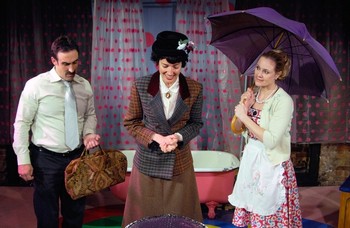 Set in New York, the show opens with glaring bright light by Travis McHale, and a be-spotted, colorful set created by Robert Monaco to resemble a baby's paradise. There is a bathtub that doubles as a bed in the living room, which not only suggests their lowly means, but that they reside in a prewar downtown apartment. Of course, the best explanation is that this family is just psychotic. There are no feelings of comfort and joy to accompany the child-inspired visuals. Instead, the spots bring an unsettling haziness and hypnosis to mind. Furthermore, we soon learn that the poor infant's home is more like the antipode of heaven. Parents John (Victor Verhaeghe) and Helen (Karen Culp) Dingleberry first appear to be a nauseatingly happy couple, doting on the newest member of their family. Before a good sense of their characters are established, they morph into squabbling, hate-filled New Yorkers who are too daft to know what the sex of their baby is, much less how to care for it. As Helen, Culp seethes like a teed-off debutante, ripping into Verhaeghe's hapless sap John with venom until Nanny (Anna Fitzwater), a Mary Poppins-like childcare provider shows up just in the nick of time to restore order. Or so they think. Nanny is full of pearls of child-rearing wisdom and tips, but her advice and presence is laced with mild violence and insanity. She is the symbol of an overturned nursery rhyme, bringing her own brand of tough love and gentle scares. Fitzwater commands the stage in the role, adding hysteria to an already manic situation, but also changing its tone. She is comfortable in her sauciness, and fits nicely between the screaming couple. Somewhere between being yelled at and soothed, referred to as various foods, slammed into the baby carriage and being kidnapped by a poor, unfit mother named Cynthia (Gina Restani), the baby manages to be self-absorbed enough to be depressed. The depression blossoms into malaise and promiscuity as the child grows into an adult, facing the ridicule associated with gender confusion and dealing with its under-developed emotional muscles. As the years go by, the parents meet other strange characters, all very vocal about the principles of parenthood, and all foolishly confident in their own performances. Everything is exaggerated in the Dingleberry world, from the oversized, Flintstone-style pieces of meat to the amplified acting. The performances all exist on one hyper plane, and unfortunately the audience can't get off it until the closing scenes where the terrors that the baby suffered in its early stages are fully realized. Verhaeghe goes from the pseudo straight man to lumbering around like a drunken Nicolas Cage without sparing the ham. Restani, in various roles, is more subdued, but occasionally falls into her own Brittany Murphy-isms. Her eyes and facial expressions, however, belie a comic talent. The consistency of the craziness, the colors of the set, and the brightness of the lights all work together to induce a headache and are exhausting. Sound Designer Ien DeNio creates a good, baby wailing soundtrack, but each time the baby is removed from its carriage, it is painfully obvious that the sound effects are attached to the carriage, and not the baby itself. The wails don't trail. Baby With The Bathwater may be a dark comedy, but it suffers from excess, both in performance and in running time. Lessons about the fallacies of parenthood and rejecting the roles that society locks people into could have been stuffed into the first act, and it should have ended there. The second act where we meet the adult baby is a let down, and for the purposes of preserving the joke, I won't disclose his or her identity here. I will say, however, that the blame does not lie with the person who inhabits the role. It is simply a joke that goes on too long, and the punchline arrives much too late for the actor to breathe into the role. Baby With The Bathwater could be construed as if it were a public service announcement against breeding, but there is hope for the abused: suck it up, and wait until you have your own offspring to ruin. It just might be the therapy that you need to work through your own issues.