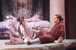 With Charlie Corcoran's strong, prideful set and Carol A. Pelletier's beautiful, period costumes, the opening sequences of Shogun Macbeth show great promise. Samurai line up and execute Michael G. Chin's simple fight choreography with intensity and determination. Unfortunately, the show never reaches its potential despite going down with a fight. Part of the blows come from the three Yojos (Emi F. Jones, Shigeko Suga and Claro Austria), or witches, that guide Macbeth (Kaipo Schwab) along his power-seeking and greed-riddled path. With striking, individual red, white and black wigs, powdered-white faces, nimble movement by Sachiyo Ito and shrill, albeit annoying voices, the Yojos are an entertaining, comical part of the production even if they sometimes overstay their welcome. They also keep the production Macbeth-like when it occasionally starts to either metamorphose into something else or get boring. The rest of the blows come from some of the actors. As Banquo, Ariel Estrada makes an impression with a solid, exciting performance that makes his bound for the throne companion, Macbeth, look limp. Too bad Estrada is almost the only one unscathed by Ernest Abuba's shoddy direction. Abuba's direction turns Rosanne Ma's performance as Fujin Macbeth (Lady Macbeth) into a horror segment when her "out spot, out!" speech looks like it's delivered by the creepy Samara character in The Ring. Another glaring issue is the text. Although much of Shakespeare's script remains in the same archaic language, it doesn't mesh well with everything else because everything else is customized for Japan. Thee and thou are out of place with hara-kiri and sake. Revamping the language to fit the circumstances could have made the dialogue sound more natural. More issues stem from the Japanese take on the material. Because the background and history have been altered and are heavily referenced in the dialogue, a glossary and list of names are printed in the playbill to assist the audience. However, since this is already an adaptation that the audience must navigate with stumbling blocks like heavy, inconsistent accents and concepts that are radically different, the audience is already working overtime to comprehend. It's asking too much of them to decipher the adaptation with a decoder ring, too. Shogun Macbeth is an ambitious effort, but the direction, some of the performances, and the inconsistencies ultimately ruin it. It may be a non-traditional view of Shakespeare, but it's a murky one, too.