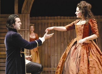 Lady Lurewell is a woman of many tempers and talents. Simply put, she is hell bent on exacting revenge on the cheating, philandering, thoughtless sex. Playing every bit the mouthy though virtuous gentlewoman in the presence of her foes, Lurewell plots and plans for their ridicule and gentle undoing with Parly (Robin Leslie Brown), her cohort and maid. Spurned by a nameless, faceless love some time ago, Lurewell has decided to declare war on all of her potential suitors, both the probable and the highly unlikely. In fact, she considers almost all men within her axis, including the ones that don't have a design on her. The primary contenders are the disbanded Colonel Standard (a lackluster John Pasha), the rich traveler Sir Harry Wildair (Bradford Cover), and the wolf in sheep's clothing, Vizard (David L. Townsend). Others such as Alderman Smuggler (Dominic Cuskern), a mature, unscrupulous and sleazy merchant, are slightly more blatant with their horizontal desires and fit into the highly unlikely category. By the time Standard saunters into St. James Park searching for his lady love, Vizard is already in the middle of courting his. Having recently been rebuffed by her via letter, he is livid but not discouraged in his pursuit. Wildair joins in later upon returning from his recent travels. They all have similar news to share: a beautiful woman that they each swear is unique and above all women has stirred their hearts and loins. By description and comedic strategy, one can easily discern that they are all referring to Lady Lurewell. Vizard, however, has every intention of foiling their attempts. To distract Wildair from his conquest and to initiate the deceptions of the play, Vizard sends him to much easier prey: Angelica (Jolly Abraham), a beautiful 16-year old courtesan in town. Preceded by a letter of introduction from Vizard, Wildair is more than willing to shell out as much as 100 guineas to satisfy his lust, particularly since Lurewell won't loosen her corset anytime soon. But instead of a willing bedmate, he finds Angelica to be haughtier and more bashful than the "game" allows. After several witty and flirtatious exchanges and scenes, Wildair learns that Angelica is an honorable lady, but his repeated affronts to her have lasting consequences. From henceforward, the baton of deceit is passed off from one character to the next, with Lurewell running several legs around the track. With a multicultural cast and contemporary inventions, The Pearl Theatre Company takes quite a few liberties with the original text of The Constant Couple. However, the newer vision is also fresh, light, and compatible with its light overtones. One of the more modern choices include the method by which Tom Errand (Orville Mendoza) gets around the stage: he glides around on those roller sneakers that by now have probably gotten on your nerves more than once on the street, but here they elicit a smile and a chuckle. Another is Lurewell's display of paintings onstage of the various men that she plays like pawns. Not only is it improbable for her to have the likeness of all of these men because there's no justification for it, but it is also impossible in the 18th century for her to have access to the art. After all, paintings are still not as accessible as photographs, and even with the achievement of the first photographic image in 1814 by Joseph Nicephore Niepce, Lurewell wouldn't even be able to get those. They do, however, do a good job of depicting her arrogance. But too good of a job. Botchan's portrayal of Lurewell is so bold that one must wonder, apart from her virginity, why she is so sought after at all? Although Botchan plays the part with a wonderful twinkle in her eye and a command of her scenes, she has no expected docility to accompany the virginity of the Restoration era, the docility that still enraptures men today. One would think that deflowering a virtuous woman back then would be challenging enough without the added attitude. The scenic design by Harry Feiner is appropriately simple, with a carefully constructed wooden set that acts as a nice backdrop against Liz Covey's lavish costumes. Although the musical interludes that conclude some of the scenes are peculiar, they do add to the levity of the play and are a means of foreshadowing much like a Greek chorus. The fiddle and what I believe to be either a harpsichord or a Bosendorfer piano are nice touches. As a collective, the cast is delightful and funny, and demonstrate their comfort with the classics with grace and airs. Eventually, the web of lies that comprise The Constant Couple do get untangled, but the journey to clarity and truth is full of entertainment and merriment along the way. At 2.5 hours, there's enough witty banter, lively characters, sauciness and hope for the lovelorn to make this production well-rounded and worthy to be seen.