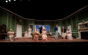 That's the beauty of Jane Austen's style. She shows how superficial, wrong-headed, even trivial some of these people can be, but her satire of their snobbery and foibles is always delightfully gentle, never mean-spirited. Although we are a world removed from her 1800 England, in so many ways, Pride and Prejudice still feels fresh. The aristocratic class structure and its social strictures are not ours, but human nature has not changed much, if at all, in the past 200 years. These characters are living today. Most educated people know the basic story, even if they didn't read the book in high school or college, because it's been done umpteen times on film and PBS. The Bennets have five daughters they want to marry off. There is some urgency about this, since Mr. Bennet's property is "entailed," meaning that by law it can pass only to a male heir. Since there are no boys in the family, when he dies the house will belong to his cousin Mr. Collins. Mrs. Bennet and her daughters are facing the prospect of becoming homeless. If the daughters do marry, will it be for love or money, both, or neither? Since it is such a popular novel, you can probably guess the outcome for at least some of the daughters. The couple at the heart of the tale are Elizabeth Bennet and Fitzwilliam Darcy, in a classic hate each other at first sight but eventually admit that they love each other and get married plot. It's a good story with lasting power, and it created a template for innumerable romantic comedies that followed, even to this day. The novel takes place in a lot of different country houses. Jane Kendall, remarkably, has adapted it to require only a single set. All the action occurs in the Bennet family's drawing room, and it works perfectly fine. The drawing room is so beautifully designed by Glenn Pepe that it constantly threatens to steal the show from the actors. But it doesn't, because the characters are so well drawn and the acting is so good. Mario Cabrera, a fine actor himself, has cast the sixteen roles very effectively and directs with style and deft pacing. Combined with the concise adaptation, the show never bogs down and never feels old-fashioned even though it is in a sense a period piece. The costumes by Joe Moncada and Sharon Welz convey that period to a T. For me, the acting honors go to Staci Robbins, doing a spot-on turn as Mrs. Bennet. This character could become tiresome in the wrong hands, but Robbins saves her by giving a masterful comic performance. Even the smaller roles, such as those played by Terri Ross and Patricia Thompson, are well observed and well acted. Annelise Wall is appropriately snooty as Miss Bingley, and Symone Platania is touching as Charlotte. Alexandra Avila, Sarah Kesselring, and Leedy Corbin all do good work as the younger Bennet sisters. The two older sisters are played by actors with more stage experience under their belts, and it shows. Fawn Hansen is the lovely Jane (everybody in the play keeps saying how lovely she is) and fits the part perfectly. The largest role in the play, and the character that goes through the most changes, is Elizabeth, and she is acted wonderfully by Paige Underwood, with not a false note. Among the men, Tim Stafford is effervescent as Mr. Bingley, David Bello lives up to his name as the caddish Mr. Wickham, Eddie Dethlefs makes the most of his brief excursions out of the library as Mr. Bennet, and James Creighton is hilariously egotistical as Mr. Collins, the clergyman in search of a Bennet girl for a wife. Nick Fleming plays Darcy, who is supposed to be the male star of the show, but he isn't on stage all that much. Although commanding of figure, his acting is not equally commanding. The character is supposed to be haughty and taciturn throughout much of the play, and Fleming plays him that way, but a little too much so. I was looking for some evidence of his burgeoning attraction to Elizabeth, and I didn't see it. A furtive glance or two, a wry smile, maybe. Of course, maybe the glances were so furtive that I missed them completely. All in all, this is a fine production of Jane Austen's perennially popular book. I'm glad that Albuquerque Little Theatre risked doing a show that might not have the widest appeal. I hope it gets the full houses it deserves. Pride and Prejudice, through September 9, 2018, at the Albuquerque Little Theatre, 224 San Pasquale SW, Albuquerque NM. Fridays and Saturdays at 7:30, Sundays at 2:00. Extra performances Saturday 9/1 at 2:00 and Thursday 9/6 at 7:30. Information at www.albuquerquelittletheatre.org or 505-242-4750. |
