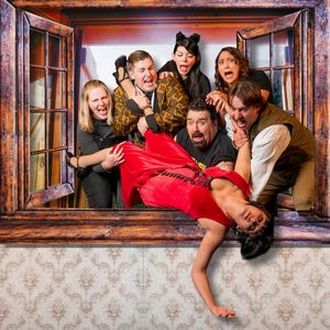 At rise, we meet the eight members of the Cornley Polytechnic Drama Society on opening night of their latest offering The Murder at Havisham Manor. The Cornley cast includes Chris Bean (Westin Huffman), who among many other duties, is also society president, and ambitious Robert, who wants to be society president. There is the shy, unassuming Dennis, and desperately debonaire and often premature Jonathan. Max, who is only in it for fun, and Sandra, an agonizingly aspiring Hollywood artiste, are also part of the group. Stage manager Annie is busy, very busy, trying to get everything in order, while the light and sound guy Trevor has already had enough of the troupe and is cranky as a result. Crew and cameo role personages (Michelle Charisse and Castalia Mayerhofer) round out the cast. Not quite ready to start, if the play's title isn't clue enough, the onstage bustle should be a hint of the chaos to come. Mr. Wiggles the dog is missing, and stagehands wander through the audience looking for him. Trevor is very vocal about his boxed Duran Duran CDs being missing, and onstage some of the set seems in serious need of repair. But nothing can dissuade this troupe from pressing forward, and within minutes, Chris, director, scenic, costume and props designer, stunt choreographer and music supervisor, who also plays Inspector Carter, gives his curtain speech. After his welcome, he reassures us this Agatha Christie type murder mystery, set in the 1920s, will be a vast improvement on their previous cash-strapped productions of, among others, The Lion and the Wardrobe, and Cat. This production is directed by Henry Avery, who gathered a great group for the production. The set is impressive, reminded me of the Addams family mansion, such are the striking array of secrets and surprises it holds. The tech booth wherein resides the irate, impatient, heavily tattooed Trevor (Brian Clifton, who was a marvelous Scrooge in last year's ALT production of A Christmas Carol), is replete with rolls of gaffer tape, posters, odds and ends, and a small trashcan overflowing with empty soda cans. The Play That Goes Wrong is a mix of slapstick, farce, satire, and more than a little Pythonesque in nature. As the cast valiantly attempt to take every disaster in their stride, determined to battle through to the bitter end, the long-suffering Chris despairs. And he has a lot to despair about. Missed cues abound, props go missing, people go missing–reappearing as other people, actors over-act, don't act, or forget they are supposed to act. And even though Trevor really, really wants to go home, the blissfully unaware cast are unwavering in their resolve that "the show must go on." So, we meet the very obliging and suave victim, Charles Havisham (Santiago Baca), who places himself on the chaise lounge even as the curtain rises. Perkins, the butler with no medical training enters, and declares his master dead–murdered, just prior to his wedding day. Charles's distraught (extraordinarily distraught–you won't want to miss this one) fiancée Florence Colleymore (by Stevie Nichols), is beside herself with grief–or is she? Romantic entanglements complicate matters further still, and the accidental injury to a cast member means stage manager Annie (Adrianne Wise, who is hilarious) must stand in for the role. Initially reluctant, this script-carrying substitute later defends her right to stay onstage with a passionate and murderous determination worthy of Bertha Rochester from Charlotte Bronte's "Jane Eyre." Max (Charlie Dearing) plays both Cecil Havisham, younger brother to the unfortunate dead-but-he-won't-lie-down Charles, and Arthur, the faithful gardener who has apparently served the Havisham household for an impressive 90 years. Regardless of which of the three characters he inhabits, Dearing has a lot of fun breaking the fourth wall whenever the humor takes him. And that's not the only fun he has. The overly affable Robert (Jim Williams) is Thomas Colleymore, brother of Florence and right-hand man to Inspector Carter, who sees himself as the only important person on the stage; he is determined to be indispensable. He is also the only one who befriends the character Dennis (Parker Owen) plays, the butler Perkins, who really only joined the troupe to make friends. Owen is delightful in this role, eager to please, and agonizing hilariously over his pronunciation of unfamiliar, literally off-the cuff, words. This is a very physical comedy. It's astounding how amusing attempted murder can be. Defenestration, on a scale even larger than that which we have learned to appreciate from our Russian neighbors, not-so-subtly crop up at the oddest times. More than once my heart went sideways watching not only the actors, but also the set itself behave in strange and unusual ways. This, being one of the most imaginative stage sets I have seen, gave rise to numerous gasps from the opening night's audience. By turns alarming, rib-tickling, or both, the technical aspects of the production are unquestionably central to its success. Very, very well done, Jason Roman, the set construction crew, and all the many stage crew members who made this all happen. I'm so impressed. Less technological–shall I say more meteorological factors?–also contribute, and every time, without fail, we all laughed. Sometimes, it truly is the little things. It must have been a lot of fun planning all these features, with a great deal of flair and talent evident in their execution. Shout out to dialect coach and dialect captain, Colleen McClure and Michelle Charisse, respectively, and also to props/sound designer Lando Ruiz. Kudos indeed to stunt coordinator Westin Huffman. The Play That Goes Wrong is a funny play. It's not innovative, but it is creative and cleverly put together. A friend in Ireland saw this play in London recently and she said it was immensely creative there as well. There are a couple of places–the seemingly endless repetition of spitti