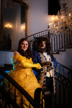 The animated version was only 84 minutes long, so it had to be stretched out and glitzed up for the stage. The movie had eight songs by Alan Menken and Howard Ashman, who was one of the cleverest lyricists of the last half century. All of these songs are in the Broadway musical, but more were needed to make a Broadway-length show. Lamentably, Ashman died before the movie was released, so Menken worked with Tim Rice to produce another six songs. One of these songs, the one for the Beast, works perfectly. The others really don't add much but they do allow for a dance number or two and for the requisite power ballad near the end. Thus, the movie was turned into a really big theatrical production: lots of set changes, lots of costumes and wigs, a fair amount of choreography, and big voices. You would think it is beyond the reach of a community theatre company, but the Albuquerque Little Theatre totally pulls it off. Hats off to director Laura Cummins Wright, music director Lina Ramos, choreographer Annmarie Sheahan, and assistant choreographer Sarah Jaeger for marshalling a cast of 31 into a tight ensemble. A great deal of credit also goes to set designer and builder Jason Roman, sound and props designer Lando Ruiz (who also has a major role on stage), and lighting designer RayRey Griego. I can't imagine how hard costume designer Shannon Scheffler and assistants Katy Jacome and Chris Appleton had to work in order to outfit the ensemble. Sometimes they're townspeople, sometimes they're wolves, sometimes they're goblins, and then they're dancing silverware and plates. Amazing. The dressers are awfully busy, as is the stage manager Tobanna Barker. Most people will know the story before they enter the theater, but it's spelled out at the very beginning. An arrogant, cold-hearted young prince is turned into a beast by a witch whom he ignores when she asks for a bit of charity. The spell can only be broken if he is able to love another person and be loved in return. All of the servants of his household have been transformed into objects like a clock, a candelabra, a chest of drawers, a teapot, and so on. Will they ever be fully human again? Oh well, fairy tales are not supposed to be reality, and it makes for an enchanted and enchanting show. The big roles are very ably performed by lovely-voiced Tiana Youtzy as Belle, Mark Pino as the Beast, and newcomer Michael Gale as the macho egomaniac Gaston. (Gaston has my favorite line in the whole show: "I use antlers in all of my decorating." Howard Ashman was a genius.) Megan McCormick does a wonderful job with the Oscar-winning song "Beauty and the Beast." Lando Ruiz and Santiago Baca are a lot of fun as the candelabra and clock, and Nicholas Handley is hilarious as the Mae West lookalike Madame de la Grande Bouche, who is turning into a wardrobe. (Salvador Dali turned Mae West's face into an apartment and her lips into a sofa, so why not?) Really, the entire cast and crew do great work, and it's no surprise that this show is selling out. It has nothing to do with the Christmas season, but you couldn't ask for a better gift. Disney's Beauty and the Beast runs through December 24, 2024, at Albuquerque Little Theatre, 224 San Pasquale Ave SW, Albuquerque NM. For tickets and information, please visit albuquerquelittletheatre.org. |
