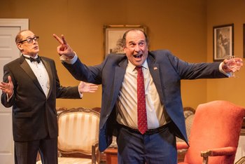 Realizing that all of this comes out of Lees' imagination, there is enough known about each of the two men that informs the way he portrays them. Nixon's infamous paranoia, Kissinger's grasping for power and influence, and their mutual loathing are all part of the recipe for what Lees dishes out. Making it come alive on the New Repertory Theatre stage are two of Boston's acclaimed actors, Jeremiah Kissel (Nixon) and Joel Colodner (Kissinger), under the astute direction of Elaine Vaan Hogue. She wisely eschews employing stereotypical caricatures, relying instead on the suggestion of the posture and bearing of the historical figures. Kissel is the more loquacious of the two, while Colodner maintains a pragmatic, stoic demeanor, for the most part. There are several opportunities for the actors to apply some shtick, as when they role-play Nixon meeting former Soviet leader Leonid Brezhnev, conversations with JFK, and visiting with Chairman Mao in China. Those scenes are light and fun to watch, before Nixon sinks further into desperation and tries to figure a way out of his conundrum. Two of the most powerful men in the world put their heads together to consider provoking an international crisis that Nixon would be the one to resolve, either delaying or avoiding the looming denouement of his presidency. The paramount concern is to save his skin, but preserving his legacy, and Kissinger's by association, is his secondary aim. The action takes place in a well-appointed room where a bar and a record player are prominent among historical artifacts. Afsoon Pajoufar's scenic design captures the ambience of the presidential residence, and lighting designer Aja Jackson helps to transform the room from the present to flashback moments. Music, recorded snippets of Nixon's voice, and the loud whir of helicopter blades at the conclusion are realistically provided by sound designer Elizabeth Cahill. Costume designer Zöe Sundra ensures that Kissinger's tuxedo and overcoat, and Nixon's suit reflect the styles of the period, and props manager Sam Martin adds to the authenticity. So much of Nixon's Nixon resonates in the political climate of 2019, perhaps more so than when it was written twenty-five years ago. I look forward to the plays yet to be written about countless closed door happenings in #45's administration. It is unlikely that there will be one having to do with an impending resignation, but looming impeachment or incarceration are not out of the realm of possibility. Unfortunately, the abuse of power and the consideration of wag the dog scenarios didn't die out with Nixon, but he got his comeuppance. Will that part of history repeat itself? Nixon's Nixon runs through October 6, 2019, at New Repertory Theatre, Mosesian Center for the Arts, 321 Arsenal Street, Watertown MA. For tickets and information, call the box office at 617-923-8487 or visit www.newrep.org. Written by Russell Lees, Directed by Elaine Vaan Hogue; Scenic Designer, Afsoon Pajoufar; Costume Designer, Zoe Sundra; Lighting Designer, Aja Jackson; Sound Designer, Elizabeth Cahill; Stage Manager, Heather Radovich; Props Manager, Sam Martin Cast (in alphabetical order): Joel Colodner, Jeremiah Kissel |
