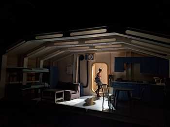 Now we find ourselves in a climate crisis, when the fiction created by the playwright seems not so farfetched. Jules (Nicholas Yenson) discovers strange behavior in fish that indicates the species is in trouble. When he cries wolf to scientists higher up the food chain, they pay no attention, so he decides to act on his own. He runs an ad on Craigslist to recruit a young woman, purportedly for "sex to change the course of the world," and journalism student Jo (Chloe Nosan) shows up in his underground lab (read: lair) for the strangest first date on record. It also turns out to be the longest first date on record when the comet hits and they are forced to shelter in placefor two to four years, by Jules' calculations. Substitute rising sea levels, burning rain forests, and a couple of the hottest years on record in place of the giant comet, and, well, here we are in 2020. Does someone have a well-stocked, subterranean lab set up for the last two humans to hunker down in and begin to procreate? If it sounds like an exhibit you'd find at Disney World or a world's fair, that thought also occurred to the playwright. Enter Barbara (Stephanie Clayman), the guide at the evolutionary museum far in the future, whose job it is to tell the audience (us) about the historic event that may have ended life as we know it. What actually happened, and what happens next, shall not be revealed in this review, but boom is a cautionary tale. Pull quotes from reviews of the play when it was first produced (2007-2008) use phrases like "riotously looks at the depths of humanity," "pants-around-the-ankles comedy," and "the funniest play seen hereabouts." My assessment differs, perhaps because times have changed and the doomsday nature of the premise hits closer to home. To give credit where it is due, Yenson and Nosan are an appealing pair of young actors who capture the innocence and insecurity, the anxiety and hopefulness of their characters. Clayman is a trooper who gives credibility to the conceit that her job is to instruct and entertain us, even when she discovers that her position may be on the verge of extinction. From her offstage perch, she sometimes punctuates the action by striking on timpani or a giant gong, and she serves as a sort of puppetmaster, manipulating the presentation by pulling levers and flipping switches to alter or pause Jules' and Jo's movements as she explains the whole experience to us. Wellesley Repertory Theatre Artistic Director Marta Rainer is at the helm of the starship boom and her design team (David Towlun, set; George Cooke, sound; Chelsea Kerl, costume; Emily Bearce and Graham Edmondson, lighting) conjures up a futuristic world, including the lab with cabinets stuffed to the gills with the necessities of life (massive quantities of bourbon, toilet paper, diapers and tampons), eerie purplish lighting that suggests the use of a backup generator, and a fabulous fish tank that holds the key to the future. After the comet hits, Barbara explains, "The boom is not just about a loud noise, but a sudden, radical change in the state of things," basically outlining Nachtrieb's focus on the end of the world and starting anew. There are some veiled political undertones (even Halliburton gets a mention) about how the government responds to disasters, as well as the museum's office politics, and we are asked to examine our own preferences about wanting to know or remaining blissfully ignorant in the face of annihilation. For these misfits, it is the chance to make an impact that keeps them going, and the takeaway seems to point to the resilience of life against all odds. As for the rest of us, what other choice do we have? boom runs through February 9, 2020, at Wellesley Repertory Theatre, Ruth Nagel Jones Theatre, Alumnae Hall on the Campus of Wellesley College, 106 Central Street, Wellesley MA. For tickets and information, call the box office at 781-283-2000 or visit www.wellesleyrep.org. Written by Peter Sinn Nachtrieb, Directed by Marta Rainer; Production Manager/Set Design, David Towlun; Sound Design, George Cooke; Costume Design, Chelsea Kerl; Lighting Design, Emily Bearce, Graham Edmondson; Stage Management, Lindsay D. Garofalo; Vocal Coach, Paul M. Valley; Fight Coach, Sarah Flanagan; Percussion Consultant, Craig McNutt Cast: Nicholas Yenson, Chloe Nosan, Stephanie Clayman |