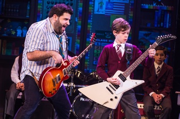 A Jack Black film isn't the first thing that might come to mind as source material for either an Andrew Lloyd Webber musical or an adaptation project for Downton Abbey creator Julian Fellowes, but they both serve the material faithfully, and well. One might forget that, after Lloyd Webber's faux-operatic The Phantom of the Opera, Sunset Boulevard, and Aspects of Love, many of his earlier efforts, like Joseph, Starlight Express, and in its own way even Jesus Christ Superstar, were pop-y, unpretentious fun. Here, he's back to that earlier form, with not-so-heavy metal rock songs along with a few softer numbers you might find in other Lloyd Webber musicals. You might also note a similarity to Phantom in its message of the redemptive power of music. Lloyd Webber, in his roles as both producer and creator of this adaptation, wisely recognized that the point of all this is the comedy. With the film a showcase for the unique persona of Jack Black, it must have been a huge challenge to find an adequate stage surrogate for Black. This national touring company, which opened in Rochester, New York, on September 30, 2017, has such a person in Chicagoan Rob Colletti. Colletti, a product of Chicago's Columbia College and The Second City Training Center who has also covered the role of Elder Cunningham in The Book of Mormon, lands all the verbal and physical laughs with skill. His Dewey is the perfect man-boy, deeply believing in rock and wanting to be a part of it, but clueless as to how to work with others and get through life as an adult with any sort of responsibility. Still, the character's belief in music and his basic kindness show through so that you root for him even as you laugh at him. Though I don't remember the film well enough to say how closely Colletti may have borrowed from Black's iconic performance, he seems to have made enough of it his own that it comes off as authentic and organic. The show is suitably a vehicle for a star, and this production has a promising one in Colletti. Colletti also has some winning co-stars in the remarkable young actors who play Dewey's students. Yes, they impress by being able to play their instruments as well as sing, but even more impressive is their skill as comic actors. They're musical, they can move, and they're funny. There's Ava Briglia as the no-it-all Summer who becomes "manager" of the band Dewey forms called School of Rock. She's snotty without being grating and smoothly makes the transition from gold-star-grubbing nemesis to ally. Theo-Mitchell Penner is the pianist turned keyboardist Lawrence, who thinks he's not cool enough for the band, but proves to be a rock virtuoso on the electronic ivories. Equally virtuosic is Zack on guitar, played by a very cool Phoenix Schulman. Gianna Harris is sweetly heartbreaking as Tomika, the new girl at the exclusive Horace Green School, who is initially too shy to audition for backup singer but ultimately gains confidence and becomes lead singer. No vocal slouches either are Olivia Buckner and Chloe Anne Garcia as the backup singers Shonelle and Marcy. Katie (Theodora Silverman) plays a mean bass and Freddy (Gilberto Moretti-Hamilton) is a big-league drummer. In charge of the fabulous costumes is the equally fab Billy (John Michael Pitera, who shows stylish gusto in the role). Supporting the rock musicians are lighting designer Mason (Carson Hodges), security man James (Tommy Ragen), and roadie Sophie (Gabriella Uhl). There's also nice work from Lexie Dorsett Sharp as the school principal, Rosalie Mullins; Matt Bittner as the nerdy Ned Schneebly, whose identity Dewey steals to snag the teaching job; and Emily Borromeo as Ned's demanding and inflexible wife Patty. Anna Louizos' scenic design uses modular walls that transform the school settings from classroom to hallway and teachers' lounge with near-cinematic seamlessness. Louizos designed the costumes as well, nicely creating the look of heavy metal rockers along with school uniforms, yuppie styles for the parents and Ned and Patty, and grunge wear for Dewey. White's screenplay and Fellowes' adaptation borrow from earlier sources, to be sure, ranging from the aforementioned classroom dramas to, as others have noted, The Music Man. But the formula works on the strength of its satire, highlighting the wisdom of children over that of adults lost in a quest for achievement and status that they seek to pass on to their kids. School of Rock reminds us that sometimes childrenand even man-children like Deweyare more in touch with what makes us human. The script and the funny but honest performances in School of Rock let the comedy and the heart land. School of Rock - The Musical will play the Cadillac Palace Theatre, 151 W. Randolph, through November 19, 2017. For tickets and information, visit www.broadwayinchicago.com or call 800-775-2000. For more information on the tour, visit https://schoolofrockthemusical.com. |
