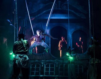 Kersnar and Lows script is not dominated by special effects, though, and there are long stretches of dialogue and character development that allow for some accomplished acting by a nine-person castsix of whom play multiple roles in addition to dangling above the stage on trapezes. Kersnar and Low bookend the story with characters and situation from Vernes The Mysterious Island, in which a group of castaways stranded on an island encounter the Nautilus and finding it their only hope of getting home, enter the vessel. They meet its designer and skipper, the mysterious Captain Nemo, who they know from the stories of Professor Aronnax and her companionsa threesome who years earlier were captured by Nemo and forced to travel under the seas with him for months before finally escaping. Nemo tells the castaways his side of the storyand thus the main portion of the talethat of the original novel 20,000 Leagues Under the Seasbegins. Following that initial framing, the main story has a setup in which the US military sends the warship Abraham Lincoln out from New York to kill what they believe to be a monster terrorizing commercial trade on the high seas. We meet the characters Professor Aronnaxwho in this telling is a woman posing as a man so that her academic work will be respectiveher servant Conseil (here Brigitte Conseil) in another gender switch from the novel, and the harpooner Ned Land (still a man). They leave on their mission and spend some time at seas before the first big momenttheir battle with the Nautilus, which they believe to be a whale rather than a submarine. Together with the introductory framing this makes for a long wait before getting to the good stuff when they lose the battle and we have our first visual bonanza. The Abraham Lincoln is destroyed and the trio of Aronnax, Conseil and Land are left floating in the water before being rescued by the Nautilus and facing the judgement of Captain Nemo. Much of what follows is a battle of wits between the brilliant but maniacal Nemo (charismatically played by Kareem Bandealy), the crafty Aronnax (the appealing Kasey Foster), her resourceful and sharp-tongued maid Conseil (a great comic performance by Lanise Antoine Shelley) and the brash, often drunken Ned Land (the comically macho Walter Briggs). Kersnar, who directs his script, admits in program notes to a desire for gender balance in reconceiving Aronnax and Conseil as women, and its a smart decision on a number of levels. Knowing Aronnax is a woman competing in a mans arena implies a strength and resourcefulness that makes her a more formidable match for Nemo. The possibility that her relationship with Nemo could become romantic adds a level of sexual tension that heightens the stakes. Kersnar and Low also include a good deal of social comment and philosophy on the idea of a man so totally withdrawing from the world and retreating to the world-within-the-world of the underwater so that he can live outside the grasp of any government. In between the set piecesincluding a beautiful pearl-diving scene (that malfunctioned on opening but was shared with the critics via video after the fact)the dialogue gives the adults (and thoughtful young audiences) ideas to chew on even as were wowed by the ability of Kersnar and his designers (Todd Rosenthal, scenic design; Christine Binder, lighting designer and Sully Ratke, costume design) to take us back 150 years and down below sea level. It doesnt quite equal the sustained level of spectacle and inspire as much awe as did the companys earlier Moby Dick, but I suspect those who didnt see the earlier play with be equally wowed. 20,000 Leagues Under the Seas will play at Lookingglass Theatre, inside the historic Water Tower Works, 821 N. Michigan Avenue, Chicago, through August 19, 2018. Tickets and additional info are available at www.lookingglasstheatre.org or by phone at 312-337-0665. |