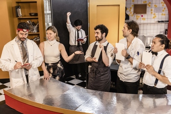 Bayless' latest work, A Recipe for Disaster!, is co-written with Carl Menninger and Amy Rubenstein of Windy City Playhouse. David H. Bell, winner of a Jefferson Award for his work on the Playhouse's Southern Gothic, directs. They've turned Petterino's Club Level private room on Randolph Street into a stage/restaurant with an interactive extravaganza that unveils a chef's worst nightmares. The scene is The Contumacious Pig, a hot new French bistro that specializes in roast suckling pig. General manager Shelley (Emma Jo Boyden) is frantic. The sous chef has called off, which means second in command, Jude (Ben Page), has to step up. Not only is he terrified, but he has no pig to cook. The purveyor is late and what finally gets delivered does not have a USDA stamp on it. This is a very important night for The Contumacious Pig, and the audience is enlisted as part of a cast of influencers: social media bloggers who have multitude likes and can encourage interest in just about anything. Two influencers, Loreen (Kierra Bunch) and Kiki (Carley Cornelius), are among the crowd, and they move from table to table, taking selfies, looking for handsome men, and scaring the staff. They both have a crush on Jude, who can barely stand up much less flirt with them. Line cook Iggy (Alex Morales) wants to support Ben, so he gives him a few B-vitamins to pep him up and keep him focused. But, instead of B-vitamins, he's accidentally given him a Xanax and not only is chef Jude loopy, his legs turn to rubber. Wait, there's more! There's a new waiter, Boris (Ian Maryfield), who is really spying on the Pig to steal recipes and use them in his own bistro. Plus, the health inspector (Ryan Reilly), a paranoid guy with abysmal low self-esteem, has chosen this night to show up as well. There's a lot of slapstick, misunderstanding, and stomach turning. The performance includes several tasty morsels and one that is deliberately inedible due to sabotage by the vicious Boris. Along with the actors' turmoil, the audience is assaulted with the smell of burnt food, and faced with the incessant talk of diarrhea, a rat demonstration, and just about anything that can go wrong in a restaurant and take it from sought-after fine dining to closed doors in one night. It's a little draining and enough to make a person rethink the need for restaurants at all. Still, high points are scored with Lainie Bayless' Paloma, a combination of tequila, fresh squeezed grapefruit, and lime, plus the roasted dates stuffed with gooey smoked Gouda, the lemony pasta with fresh succulent crab bites and artichokes, and the decadent chocolate mousse passed out during the show. The cast creates the heart-pounding bustle and stress of an actual restaurant. Along with the chaos in the kitchen, betrayal by a rival chef and the kumbaya camaraderie in the kitchen, there's Felix, the bus boy, played by the thrilling Daniel Trinidad. Trinidad is a superb acrobat whose goal as a performer is to "leave you with something to remember every time you see him." He has the strength to do things that defy gravity, like jump up on a high counter. He can circumvent disaster like no one else. He has the agility and grace to make it look easy, but he's someone special, a gifted performer who causes the audience to burst into applause and hysteria in every scene he steals. A Recipe for Disaster runs in an open-ended production at Petterino's, 150 N. Dearborn Street, Chicago IL. (The entrance to Windy City Playhouse is right around the corner on Randolph.) For tickets and information, please visit windycityplayhouse.com. COVID-19 Safety: (1) All guests will be asked for proof of vaccination at the door. Vaccination must have occurred at least 14 days prior to the performance. Our hope is not to have to require masks, but we will follow whatever is mandated by the City or State government at the time of the performance. (2) Alternatively, guests may show a negative COVID-19 PCR test from the past 48 hours. Those guests who are not vaccinated will additionally be asked to wear a mask when not actively eating or drinking. (3) If you are not comfortable holding onto tickets for your performance date, you may be issued a credit upon request, and you may opt to reschedule for another showtime. At this time, we cannot offer any refunds. (4) This COVID-19 Safety policy is subject to change. For questions, please email us at: boxoffice@windycityplayhouse.com or call 773.891.8985. Thank you for your cooperation in keeping our artists, staff, and fellow audience members safe! |