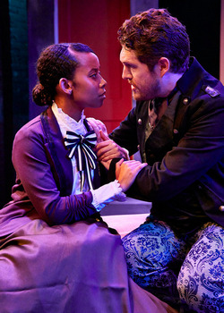 A number of the choices that Dalberg makes in his adaptation are intriguing, beginning with the fact that Henri Jekyll is a woman rightly frustrated with the restrictions she is forced to live under in Victorian England. The creation (or manifestation) of a licentious masculine alter ego who can walk in the world lends the story purpose more compelling than the mad science motivations in Robert Louis Stevenson's original story. Similarly, Dalberg knits the characters, who are mere acquaintances or estranged friends in the original, into a tighter, more intimate, and more emotionally charged web. Utterson is no longer simply Jekyll's lawyer but her love interest, and Hastie Lanyon is not simply Jekyll's intellectual foil; rather, the two are entangled in a dark history with Danvers Carew, the Member of Parliament whose murder by Hyde is transformed from a simple sign of Jekyll's uncontrollable descent into depravity into something more complicated and ethically ambiguous. Ultimately, though, the motivation behind and meaning of Danvers' murder is just one of many things that seem to be too complicated for the production to convey clearly in its two-hour running time. Dalberg adds Jekyll's father as Hyde's first victim, dead from a presumed accidental fall before the play starts, to tie the two together, but most of the revelations about Lanyon's sexual exploitation by Danvers and Jekyll's abuse by her father are timed too oddly and handled too briefly to add the seemingly intended interest. In the latter case, the eleventh hour revelation of paternal abuse also somewhat undercuts the impact of Jekyll being a woman by piling on, as though disregard for her intellectual and professional movements, as well as her loss of freedom of movement (another element that is not clearly explained), would be insufficiently serious motives to drive her to creating Hyde. There are other points of confusion and seemingly dropped threads throughout. Although Stevenson's original, retrospectively narrated story takes place over the course of more than a year, here, the timeframe seems to be the days surrounding Danvers' murder, but it is not clear whether it has been weeks or months since the murder of Henri's father. Enfield, upon first encountering Utterson and (briefly) Hyde at the beginning of the play, and again at the scene of Danvers' murder, seems to be a philandering police detective who never investigates the murder, even after finding Jekyll's father's cane at the latter's murder scene. The most unfortunate lack of clarity centers around the title characters themselves. Dalberg's intentions for the relationship between them is never successfully communicated. At times, it seems the adaptation departs from the traditional bodily transformation of one into the other to imply that both simultaneously manifest in the physical world; at others, it seems clear that the other characters see a single physical form, even when the audience can see and hear both aspects of the psyche. In the play's climax, Utterson breaks through a locked door and seems to directly address Hyde, asking where Jekyll is. Not long after, however, he seems oblivious to Hyde's physical participation in Jekyll's sexual advances and completely disregards Hyde's presence as Jekyll takes her own life. The fact that the shortcomings in the text and the ways in which the direction never quite overcomes them are frustrating is, paradoxically, a testament to the strengths in other aspects of the production. Stina Taylor's set is attractive and functional. Through the use of a pair of rotating flats and just a few pieces of furniture, Taylor distinguishes the exterior action on the streets from the scenes that take place inside the homes of Jekyll and Lanyon. Furthermore, with the help of Laura J. Wiley's lighting design, Taylor communicates the sinister possibilities beneath each claustrophobic interior space. Jessie Gowens' costumes add to the striking, successful visuals. Henri's polished, respectable garments have masculine touches as she beats back Hyde, receives Utterson and Lanyon as visitors, and makes one last desperate bid to show everyone at the university from which she has been banned that she is in control of her own destiny. In one brief scene, we see her in a plainer skirt and blouse that has more traditionally feminine lines, suggesting that when she has her sleeves rolled up and is working, she won't take the time to perform any particular identity. Hyde's patterned, textured trousers, as well as his calf-length coat with its double row of buttons combine a Wilde-adjacent foppishness with a touch of military potential for violence. Utterson's period-correct suit, just as (intentionally) forgettable as Carew's, is not, with its loud vest that provides an echo of Hyde's debauchery. The sound/music design by L. J. Luthringer is not quite as successful as these other elements. At the beginning and the end of the play, what sounds like a scratchy (and out-of-period) radio announcer talks about the Ripper murders (which did bring to mind Stevenson's story when they first began, two years after its first publication), but rather than adding to the atmosphere, this simply amplifies the confusion, as it is unclear at the end if Utterson and Enfield conspire to attribute Henri's death to the Ripper. The between-scene music is synth-heavy rock that is overly loud in the small black box space and jarringly out of sync with the otherwise period-true choices. Brandi Jiminez Lee (Jekyll) and Jack Sharkey (Hyde) are excellent both individually and together. Jiminez Lee does a wonderful job of moving the character fluidly through internalized repression and into rage-fueled desire for liberation through a series of dramatic choices that avoid whipsawing from one to the other. Her performance is so nuanced and well done that one really wishes for a clearer text than did not (perhaps inadvertently) impart almost all of the character's sex