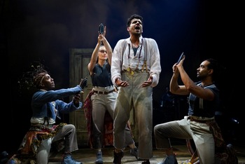 Rice's adaptation is, for the most part, simply a streamlined version of Brontë's story. It opens with Lockwood's arrival as the tenant at Thrushcross Grange, then casts its gaze back in time to untangle the history of the grim cast of characters he enounters. Rice's major change is the elimination of Nelly Dean, or rather her transformation into The Moors themselves, played by a number of actors who propel the story through dance, song, movement of the pieces of the set, and attempts to advise characters, as well as emotionally decode them along the way. The device might sound hokey on paper, and it's easy to see how it could become intrusive or heavy handed under the wrong director, but here, it tempers the story's high, gothic passion with humor and compassion. It also serves the quite practical purpose of reminding the audience of the where, when, and who of a narrative in which a handful of names are recycled and time and place can be difficult to keep track of. Vicki Mortimer's set design lifts the tension between the elemental and the civilized from the page, such that Wuthering Heights and the Grange are characters, too. The upstage wall is a giant screen on which a changeable sky is projected, as well as occasional text, suggesting the credits of a black-and-white movie. The band sits upstage left, whereas upstage right is a precarious-seeming collection of ladders that lends a hint of topography to the scene. Around the perimeter of the stage are a dozen or so wooden chairs where the actors playing The Moors and other minor characters sit, occasionally handing off items to others on stage. The houses themselves are represented by nothing more than two flats–one a patchwork collection of doors and the other a similar jumble of frosted windows–that The Moors wheel quickly on to the stage and just as quickly spin around to take the scene from exterior to interior. Inside, rooms are typically suggested by a pair of chairs, once again on wheels, each of which is set beneath a kind of nest of more mismatched wooden chairs that have been turned upside down and lashed together. This create that uneasy impression of a barricade, but also the weight of the interior world threatening to crash in on the characters. Mortimer's costumes use similar techniques to convey the battle between nature and civilization. For The Moors, she uses a baseline of dark, short-sleeved shirts, work trousers held up with braces, and patchwork bustles that trail behind them like the windswept landscape. Catherine and Heathcliff, as children and adolescents, wear trailing garments that suggest night clothes paired haphazardly with sweaters and jackets. Later, their cruelty to one another wraps them in painfully proper clothing. Edgar and Isabella, as well as Dr. Kenney and, later, Little Linton, look like dolls in their comically tidy, fashionable clothing. In terms of the staging, Rice's direction is crisp and tight enough to look like chaos. Paired with Etta Murfitt's movement direction and choreography, this gets to the heart of Brontë's novel and makes a case for its timelessness. The music (Ian Ross, composer, with music direction by Pat Moran) also supports Rice's vision, although the two instances in which Catherine takes up a hand-held microphone and the scene suggests a music video are somewhat jarring in an otherwise effectively cohesive show. For the opening night performance, Katy Ellis stepped in for Leah Brotherhood as Catherine. She is compelling as young Catherine, both before and after the transformative brush with comfort and civilization at Thrushcross Grange. The brief experience the audience has with Catherine after her marriage is a bit less effective. Rice, understandably, seems interested in the fact that Catherine's upbringing has left her emotionally and psychologically damaged, but this is a bit rushed. That may be partly attributable to the fact that Rice, as indicated in her Director's Note, is particularly focused on Heathcliff and his ambiguous racial and social identity. Liam Tamne benefits from that focus in the text and, for the most part, humanizes Heathcliff without downplaying the violent, cruel creature life makes of him. As the Leader of the Yorkshire Moors, Jordan Laviniere is a wild, joyous presence. Rice's script inserts the character into the story with precise and perfect timing and Laviniere is attuned to every comedic, compassionate beat. Sam Archer is absolutely wonderful as Lockwood and Edgar Linton. His physicality and gift for comedy evokes Gene Kelly in costume spectacles like The Three Musketeers, and Archer complements that with strong dramatic work in Catherine's death scene. The same can be said for Georgia Bruce who is delightfully absurd as both Isabella Linton and Little Linton, but who also lets the audience feel the depths of Isabella's agony when Heathcliff rapes her on their wedding night to produce an heir to the Grange. At the opening night performance, TJ Holmes more than capably supplemented the much-needed humor in the roles of Mr. Earnshaw and Dr. Kenneth, all while also playing cello and accordion. It's hard not to think of any actor as being saddled with the characters of Hindley and Hareton, but Tama Phethean injects humanity into both. Even through the coarse, drunken stupor, Phethean believably conveys Hindley's erratic but sincere love for Frances and his devastation at her death in childbirth. As Hareton, he elevates what feels in the novel like a plot device in making the audience believe his devotion to young Cathy. Eleanor Sutton plays opposite Phethean in both roles, and the two deserve a great deal of credit for fleshing out play's emotional world with those two relationships. Wuthering Heights runs through February 19, 2023, at The Yard at Chicago Shakespeare Theater, 800 East Grand Avenue, Chicago IL. For tickets and information, please call 312-595-5600 or visit www.chicagoshakes.com. |
