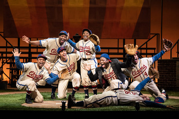 Whatever the shortcomings of the second act, it's clear that Diamond came away from Martha Ackmann's "Curveball, The Remarkable Story of Toni Stone" with not only a sense of this extraordinary woman that was quite precise, but also with a clear vision of how to contextualize that story and translate it to the stage. Although the playwright clearly leaves much to the discretion of the director and cast, it is equally obvious that she insists on the broad strokes vital to documenting and bearing witness to the triumphs and indignities suffered by Toni and Negro League players more broadly as they carved out a place for themselves in the game that was their passion. The combination of Todd Rosenthal's set, Mike Tutaj's projections, and Keith Parham's lighting design places the audience within the confines of the diamond itself. The stage is more or less realistically set with a home plate, bleachers, and a projected scoreboard upstage center, the team's dugout along the first-base line (stage right), and a dive called Jack's, where Toni meets her eventual husband Alberga, along the third-base line, replaced by a scarred, faded Doublemint gum ad on a low brick wall when the tavern's two stools and swing-out bar top are tucked away. Although the set is attractive and immersive, there's quite a bit of real-estate devoted to bleachers rising above the dugout and the third-base wall. This space is rarely used and the main stage area feels occasionally crowded, particularly during the team's performances. Tutaj's projections shift to faded velvet curtains or Jack's neon sign or to the front of a neat, respectable house to signal that the action has moved off the field–and sometimes back in time to Toni's childhood–but they are at their most spectacular when they are coordinated with the actors' movements and Andre Pluess' sharp sound design to bring the game to life. Mara Blumenfeld's costume design captures the vintage uniforms of the Indianapolis Clowns beautifully, and by Diamond's specifications, the uniforms are ever present. Toni, when she is off the field, slips on a men's suit jacket and hat. As the actors who primarily depict her teammates shift into other roles, often changing genders, races or ages, the change is signaled by the simple addition of a jacket, tie, a headband, or some other subtle visual cue. This serves to filter everything in the play through the lens of Toni's laser-focused passion for the game, despite the fact that by her own admission, she "Never could tell a story from beginning to end all nice and neat." In keeping with this facet of Toni's character, Act I travels back and forth in time and from nowhere town to nowhere town as she convinces her mother to let her play ball, and as she hustles to get fill-in games under her belt. In this act, the dialogue and action fluidly and skillfully flesh out each of the players–from the bookish yet randy Spec to the talented, embittered Woody, and King Tut, the team's legendary showman. They discuss Jackie Robinson's journey over the colored line, their confidence in their own elite skills, and the act ultimately ends with the team, as a body, stepping in to perform on a day when King is too worn down to play his usual role. The clownish dance, punctuated by Toni's stark narration of its subtext, turns wild and rageful–a stunning end to a tight, skillfully written and executed act. This climax follows developments on the personal front for Toni. Through her relationship with Millie, one of the ladies at Madame Mamie's Gentleman's Club, the literal, non-romantic Toni navigates the advances of the smooth, older, politically connected Alberga who ultimately proposes marriage two her. Act II then focuses on Toni's balancing act as she finally joins the Clowns as a regular player and accepts her feelings for Alberga. The second half of the script is still very good, but the first half is so exceptional that "very good" is a bit of a let down. The ending feels particularly rushed and somewhat unsatisfying. Woody focuses his bitter disappointment on Toni and translates it abruptly into intense threats of sexual violence. Alberga responds in a quiet, menacing way, claiming ownership of what's his, that is certainly appropriate to the almost entirely different world he occupies. Terence Sims (Woody) and Chiké Johnson (Alberga) play these scenes remarkably well, but they feel lifted from someone else's story, and the play is, at this point, so close to its end that there is little time to contemplate that this interaction demonstrates how well-founded Toni's fear of being tied to a man, rather than taking care of herself, were in the first place. Tracey N. Bonner's performance in the title role is perfection, from the opening moments up through and including the rough-edged end of the play. Her comic timing in the play's big moments is as exceptional as her physicality as she bats, fields, and joins in the clowning. Bonner blends this charisma seamlessly with Toni's rigid, black-and-white worldview, the way she continually stumbles through relationships with those whom she cares for deeply, and her near-constant recitation of player statistics to maintain some semblance of control in a world that is violent and unpredictable. Bonner's performance would not work at all without the work of her cast mates, particularly Jon Hudson Odom as Millie. Although Diamond indicates in the script that the role should be visually indicated by the addition of a single item of women's clothing over the Clowns uniform, the costuming here has Odom in a deep purple silk chemise and a brightly patterned silk robe with a flower tucked behind the ear through most of the play. Still, every beat is true to Diamond's dictate that productions avoid exaggeration, stereotype, or any hint of cross-dressing. Odom is painstakingly quiet, genteel and self-contained, yet steely when Toni makes her oblivious proclamations that a person–any person–can achie