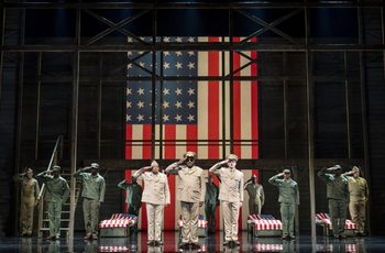 Fuller's play (which is fictional but based on the troubling reality of racial division both in 1944 and today) is, ultimately, a kind of procedural. After the murder of a Black sergeant at a base in the deep South, the powers that be appoint a Black captain, Richard Davenport (played by Norm Lewis), to try to identify the killer, and we see him as he questions everyone who might conceivably be a suspect. Supplementing his interrogations, we flash back to some of the key moments that led up to the killing, cleverly intertwined with the questioning itself. The first Black officer anyone in this company has ever seen, Davenport is greeted with excitement by the Black enlisted men but skepticism by their commanding officer, Captain Charles Taylor (sympathetically played by William Connell). Taylor's reaction stems not from any overt racism–though he is open about his surprise at seeing Davenport–but from his conviction that two white officers under his command are responsible. He believes that Davenport was appointed mainly to protect these two, as no high-ranking Southern officers would support the prosecution of white men for killing a Black man. Lewis' demeanor of authority quickly makes it clear that he will brook no interference, and his booming, sonorous voice easily cuts through any and all nonsense as he interviews the soldiers one by one to find the truth. Unlike Taylor, he rejects the easy Klan-inspired conclusion that the white officers are guilty. While retaining a healthy dose of skepticism regarding these men, one of whom is such a blatant racist that he uses the N-word many times throughout the show, he thinks something else is afoot. Eugene Lee plays the dead man, Sgt. Waters, in flashbacks that prove him to be the kind of Black man who places the blame for the prejudice against his race entirely upon its shoulders. Like a military-minded Booker T. Washington, he insists that the path to acceptance is to be exemplary. He staunchly holds to the belief that any "Negro" who, by action, appearance, or lack of education, feeds the myth of the "lesser" race, is not to be tolerated. When a popular new recruit, C.J. Memphis (Sheldon D. Brown), falls short of his ideal, he engenders a powerful dislike for the sweet, innocent soul in the huge, athletic body who entertains his fellow soldiers on his guitar. His mistreatment of Memphis is just the most noticeable way in which he uses his stripes to attack and demean anyone in his charge who might in any way debase the Black race in the eyes of the Whites. Naturally, he is such a detestable man that there are all sorts of candidates beyond the racist white officers who might have wanted him dead. I sat there throughout thinking that, despite a set by Derek McLane that manages to divide the CIBC's stage into smaller playing areas, things get lost in the huge Broadway-style theatre. As my husband is in a wheelchair, I watched from the back of the orchestra wanting to feel the emotional power of the subject matter. At times, such as Davenport's questioning of the White officers–wonderfully played by Chattan Mayes Johnson and Matthew Goodrich–and the flashback showing how they did abuse Waters, that power makes everything else disappear. More often, though, I felt that I was watching a TV production that had no close-ups. Despite Leon's staging, great acting, and lighting by Allen Lee Hughes that does its best to focus us on small portions of the set, the 1800-seat CIBC swallows the most personal moments of this intense play. I kept imagining seeing it down the street at the Goodman, where those personal moments feel much closer. Ah well. A Soldier's Play is an important work that evokes a time and place in 20th century American history that those of us who are white don't often see depicted and, perhaps, don't know much about. Instead of taking the easy road, Fuller focuses on Waters and the ugliness and nastiness he represents, illustrating that, wherever it comes from, racism is a painful sore on the body of humanity. The CIBC may not be the best place to see this play, but it is one that is well worth seeing. A Soldier's Play runs through April 16, 2023, at CIBC Theatre, W Monroe Street, Chicago IL. For tickets and information, please visit www.broadwayinchicago.com/show/a-soldiers-play/. For more information on the tour, visit www.roundabouttheatre.org/get-tickets/2022-2023-season/a-soldiers-play-tour/. |