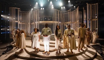 The story transports that last-written of Sophocles' Theban plays, Oedipus at Colonus, to an African American Pentecostal Church, where a pair of evangelists draw on the story of the end of the title character's life for the central lesson of their service. Although the text borrows chapter and verse from Sophocles, the retelling is fluid and impressionistic, with the evangelists and the characters often presaging and echoing one another's lines. On paper, this might seem calculated to render an already tangled ancient family drama completely inscrutable to a contemporary audience. Quite the opposite, though, through music, movement, and electric connection, this tells the audience everything timeless and worth knowing about the story. John Culbert's scenic design carves the stage into a series of sinuous curves that offer some change in elevation. The "steps" this creates are appropriately treacherous, presenting an obstacle not just to blind Oedipus, but anyone who would try to move swiftly or without the support and guidance of the community. If this suggests the natural environment and the ancient world, the upstage elements speak to a constructed house of worship. A series of slim, blonde wooden slats rise from the floor past a catwalk that curves across the entire width of the stage. Upstage left, a spiral staircase affords access to a balcony where the band is housed. The deceptively simple design manages to convey a devout congregation, but also one that has found some worldly comfort and ease. This image is underscored by Keith Parham's lighting design that works in both subtle shifts and frenetic bursts, as well as by the effortlessly slick sound design by Sarah Ramos. Raquel Adorno's costumes contribute greatly to the show's dream-like beauty. Most of the cast is dressed in off-white accented with muted gold and sand tones. The lines and "flavor" for each member of the cast are distinctive and specific to that individual, and yet they are pointedly a collective body, a theme Adorno emphasizes with the scarves and handkerchiefs the actors incorporate into their individual and collaborative numbers. There are three exceptions to the color palette: Creon the lone white actor is arrayed in a bright, artificial white that manages to clash painfully and purposefully with every other garment and hue on stage. Polyneices, when he arrives, is clad in black with flashy gold embroidery on his tunic. And Oedipus himself is draped in flowing garments that have hints of silver and blue, foreshadowing his death and release from his torment. For a show that is moving, uplifting and devastating, it's somehow hard to talk about individual performances, as this depends so deeply on the way the entire cast feeds and sparks off one another. Nonetheless, as Theseus, Mark Spates Smith is an exquisite singer and an earth-shaking presence, as is Jessica Brooke Seals as the Evangelist. Juwon Tyrel Perry's nearly a cappella performance of "Fair Colonus" is devastatingly beautiful. Aeriel Williams conveys the whole burden of Antigone's story in every one of her movements and every line she sings, and Ariana Burks' Ismene is the perfect, sunny foil to her. Kai A. Ealy is so charismatic that one wants to believe Polyneices is sincere and selfless in seeking his father's blessing. Most importantly, as Oedipus, Kevin Roston Jr. commands the attention of the entire room. The tight, skillful direction of the large cast has all eyes on him at every moment, and the individual reactions to him and the revelations about his history are nuanced and varied. But it is Roston's presence and power that makes every response believable. Although he's not visible on stage and all the musicians are glorious, Mahmoud Khan deserves special mention, not just for serving as the conductor, but also for filling the space to the rafters with the sound of that Hammond organ. The Gospel at Colonus runs through June 11, 2023, at Court Theatre, 5535 S. Ellis Avenue, Chicago IL. For tickets and information, please visit www.CourtTheatre.org or call 773-753-4472. |