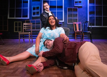 With little to no room for a set, Adrian Luka Tirado has arranged a series of window frames of varying sizes on the upstage wall. This suggests the cheek-by-jowl living spaces of New York, but also hints at the themes of voyeurism, surveillance, and opportunism that run through the show. The only other "set" pieces, half a dozen mismatched kitchen chairs, mirror these themes, as ensemble members often occupy them, watching scenes involving the main characters intently, sometimes lying in wait before they burst on the scene. This, in turn, is echoed in the blocking, where Kapinos not infrequently has characters who are talking to another direct their lines to some section of the audience, rather than trying to force either proscenium or semi-in-the-round interactions. Well-supported by Benjamin Carne's lighting design, the result is an interesting depiction of the shallow interactions Frank, Charley, and Mary encounter as they pursue their careers. Thus, the minimalist-by-necessity approach becomes a dramatic opportunity well seized. Cindy Moon's costumes are another strength of the production. Outfitting a large number of actors for a show that springs backward in time over a period of twenty years is no mean feat. But Moon has a well-developed visual language that accomplishes this, and characterization to boot, seemingly via a combination of out-of-closet and thrift store fashion. For example, in the opening scenes, depicting the latest point in the show's timeline, Frank's green skinny tie and loud trousers in a similar shade are an effective nod to selling out and questionable taste. As the story reverses, though, he wears the same tie, but with grey pants that match his sport coat. Earlier still, the soft lilacs and greens of his wider, more traditional tie link him to the color palette of the pretty though slightly frumpy dress that Beth wears to Joe Josephson's party. Although the space at the Vaughn Theatre is very workable, one of the more serious challenges to mounting a musical is the fact that there is truly nowhere to put the orchestra other than the green room, which is separated from the performance space by a wall. Pulling off Sondheim under circumstances where the actors cannot see the musicians or the conductor (Sachio Nang) is quite the high-wire act, but this group manages it. Of the main cast, Brittney Brown's performance as Mary is the strongest, vocally and dramatically. From the opening, she has the mandatory comedic beats well in hand, and she wrangles Frank and Charley without ever being reduced to the harried gal pal. She even manages to breathe some life into the fairly thin plot line of her unrequited love for Frank, particularly in the reprise of "Not a Day Goes By." Christopher Johnson and Dustin Rothbart, as Frank and Charley, respectively, are also engaging and vocally strong. Johnson has somewhat more material to work with to convey Frank's transformation, and he acquits himself well in doing so. Charley is not as well fleshed out in the book, but Rothbart productively plays with what is and is not there to create something three-dimensional. As Gussie, Brandy Miller, too, is up to the task of inhabiting a character that is somewhat neglected in the raw material. In "Growing Up," her steady command of the vocal part means that she has focus to devote to injecting some genuine pathos into a role that can too easily devolve into a kind of plot device bitch. As Beth, Justine Cameron's voice and demeanor serve as an effective foil to Miller, rather than an overly simplistic polar opposite. Along with Johnson and Rothbart, she flashes some serious comedic chops in "Bobby and Jackie and Jack." As Joe, Gussie's cast-off producer husband, Aaron Mann plays the comedy well, but also offers grounded moments when he shares with Mary and Charley his pain and foolish hope that he can wait out Gussie's affair with Frank. Merrily We Roll Along runs through July 23, 203 at Reginald Vaughn Theatre, 1106 W. Thorndale, Chicago IL. For tickets and information, please visit www.blanktheatrecompany.org. |