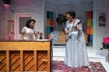 Perhaps the most serious issue with the play itself is its own crisis of seriousness. Early on, despite the considerable (and enjoyable) humor generated by Rosetta's prickly yet eager approach to Marie and all she has to offer to Tharpe's own career, Brant manages to pique the audience's interest. Sister Rosetta is exacting and wary, to be sure, but she is no eccentric, erratic character, determined to run roughshod over the prim, nervous young woman she has managed to lure out on to the road. She goads Marie, certainly, but strategically, so that the two can open a genuine mutual dialogue about musical styles, the meaning and purpose of art, and its relationship to salvation. The exchanges during these early sections of the play are engaging. The dialogue is just naturalistic enough that the audience is never led to question how it is that two women who barely know one another would come to such intimacy in so short a span of time, particularly given the very real trial by fire that touring artists undergo. By the play's end, however, the depth and quality of the exchanges decline steeply. Although it's not quite accurate to characterize Brant's play as a jukebox musical, there is a definite sense that Brant is ultimately there primarily to string together the (admittedly transcendent) musical performances. The uneven interest in and attention to the various aspects of these very real women's lives is not just disappointing in the way that any show with a weak "second act" (the show has no intermission) might disappoint. Rather, Brant's lack of (or at least intermittent) interest in specifics like sexuality and race undermine a seemingly sincere desire to honor two women who have never been given their due. In particular, consigning the lone kiss between the two characters to a goodbye Marie is saying to Rosetta, having made up her body for the funeral service. This is particularly troubling given the amount of time devoted to discussing the men in both women's lives. The end result is the (presumably unintentional) implication that their romantic relationship (and perhaps all Tharpe's relationships with women) emanates from despair at the cruelty and depravity of men. This, at the very least, flirts with denial of the full humanity of the play's subjects. Although Northlight's specific production has its strengths, these are not always enough to overcome (or even avoid complicating) the shortcomings of the play itself. John Culbert's set design is quite solid, on the whole. Culbert frames an irregular space on the thrust stage with three coffins: what is clearly the deluxe model is set a step above the rest of the stage, up center, and enclosed by a bay window in stained glass. Upstage right, a more squared off, nondescript casket in a darker wood sits head to toe with the downstage cot. Up left, at an oblique angle, is an open casket fronted by a bench supporting Rosetta's resonator in its case, and her Vox amp. Otherwise, Culbert's set comprises a small round table with a pair of mismatched, straight-backed chairs, just in front of the amp, and a short, backless pew that sits just downstage of the upright piano. The overall suggestion is a cross between a church basement and a funeral home. This is somewhat awkward, as dialogue specifically notes that the place in Mississippi the band has secured for both rehearsal and accommodations is a funeral home and insurance agency, but certainly, the dressing of the set and the careful build-out of scrubbed but worn white wood emotionally captures the space, even if the play saddles the design with an unworkable line. McKinley Johnson's costumes, which seem to bleed into the props, are similarly very well done. Rosetta's twinkling silver, floor-length gown with its cape makes the most of Thomas's tall, imposing figure. For the diminutive Marie, Johnson chooses a demure, full-skirted, silvery pink, tea-length dress and pink Mary Jane pumps. The looks complement one another, but also make the most of the contrast between the actors' body types, which provides an unexpected and welcome lift to the comedic rapport between the two. The lighting (design by Jared Gooding) and sound (design by Rick Sims) are somewhat less successful. Gooding seems to have been charged with signaling the play's unreality well before the play itself offers any real indication of this facet of the text that does not read as simply some clunky dialogue. Each time one of the characters launches into a musical number, the lighting changes (and some changes occur within numbers), but the nature of the changes is not always clear. Late in the play, there are dynamic lighting cues suggestive of a club or even an arena setting. When Rosetta arrives downstage to perform a Cotton Club number, we finally understand, thanks to a wash of smoky blue light, that we are in the world of memory, but there's little before this point that leads the audience's attention to this device. Most awkwardly, there's a sudden rainbow lighting cue that seems completely unattached to the romantic relationship between the characters. It's unreasonable to demand of a production–or indeed of its actors–that the cast be able to play piano and guitar with the facility required to do justice to their real-life counterparts. To the credit of Roston and Thomas, their "faking" on piano and guitar are far better than good enough. However, the way the production navigates sound during the musical numbers is sometimes distracting. The actors are miked for dialogue. When they are singing, the addition of a bit of reverb is subtle enough not to distract. However, the volume of the piano shifts (sometimes within numbers) in a way that is not reconcilable with the visuals, and there is no convincing explanation for the fact that the resonator's volume exceeds that of the electric guitar. Whatever shortcomings the production has are paradoxically amplified, because one truly wants the absolute best for the perfo