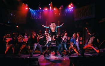 I'll be honest: I never saw the show before this opening night, and in fact never thought I'd missed anything much. I was so wrong! Yes, the show exists as a not-very-embellished excuse for playing lots of fun songs the audience will remember and enjoy–but so what? If we like the characters (which we do, even the worst of them), if we love to laugh (who doesn't?), and if '80s rock doesn't make us cringe (and let's face it, '80s rock went far past cringe at times, but the very fact that we fondly remember songs like "I Wanna Know What Love Is," "Just Like Paradise," and "Waiting For a Girl Like You" tells us that the decade produced some excellent work), we are bound to enjoy the play. (Note though: the title song, "Rock of Ages" by Def Leppard, does not actually appear in the show, which is weird, but with so many memorable tunes here, who really cares?) Director Tommy Novak doesn't miss a trick when it comes to staging this show for full-metal silliness. They obviously know that absolutely anything goes, so they pull nothing back. I imagine them just laughing and saying "sure" to every weird idea anyone threw at them. (Can we put a male dancer in drag in the stripper dance? Sure, why not? Let's put him on a balcony and spotlight him! We can thumb our collective noses at Tennessee!) I'm sure Novak had at least as much fun as anyone else creating this production. As the narrator, Lonny (who is also a character; he works at the Bourbon Room, where most of the play takes place), Michael Metcalf (one of many actors wearing absolutely wonderful and huge wigs by wig designer Keith Ryan, whose work here reflects pretty much every style you remember from the '80s) jumps in and out of character so much that, by himself, he turns that fourth wall into a random pile of broken garbage. He is so much fun that we go along with anything he does, and so good at everything that he gives away the focus in choral numbers and then smoothly jumps back in, seemingly out of nowhere. He's so genuine that even his campiest scenes–and there are many–don't diminish our affection for him. And, like everyone here, he has a killer rock voice. Speaking of killer voices, the romantic leads, David Moreland as wannabe rocker Drew and Kayla Marie Shipman as aspiring actress Sherrie, have the kind of voices you build shows around. Here he shows off a brilliant rock tenor that would have been at home with most of the groups featured in the show, while she (a real triple threat, acting, singing and dancing) is a Broadway-level soprano who brightens every scene she is in. Their characters meet sort-of cute and seem instantly destined for each other in a Danny and Sandy kind of way, but Drew is too shy to state his love out loud, with the result being that he ends up calling them "friends" to her face. It's awkward, but we've all seen this kind of thing before, so even when he is delivering food and she is dancing in a "gentlemen's club," we know these are merely dues they have to pay before happily-ever-after. That gentlemen's club, by the way, is owned by Justice (Sharriese Hamilton), who lends her own glorious voice to "Harden My Heart" as she tries to convince Sherrie that she will be all right if she takes a job in her club. Later, she joins with other characters feeling down about their lives in "Every Rose Has Its Thorn." The Bourbon Room, meanwhile, is owned by Dennis (Steve Watts), who seems a bit enigmatic at the start but, once we really know him, is an extremely likable character who even attracts the affection of one of his workers (in one of the play's most high-camp moments). Other significant characters and plotlines involve Jeff Diebold and Aaron Davidson as father-son Germans who are behind the urban development that threatens to remove "sex, drugs, and rock and roll" from the entire Sunset Strip. (Davidson, in particular, is outstanding in a breakout role.) The son falls in love with the leader of the protests against the project, former City Planner Regina–"rhymes with pussy"–played by Veronica Garza, who adds many layers of camp to this already campy show. (It's the kind of musical that names a character Sherrie Christian just so it can pay her tribute with songs featuring both of her names: Steve Perry's "Oh Sherrie" and Night Ranger's "Sister Christian." It's also the kind of musical that isn't afraid to add bits of choreography (by Laura Savage) and blocking that imitate things we remember from the '80s.) Meanwhile, Stacee Jaxx (Donovan Hoffer), the constantly drunk and/or stoned lead singer of a band called Arsenal, arrives as a hoped-for savior for the Bourbon Room but actually destroys everything he touches. Jaxx is the living embodiment of the decadent rock lifestyle, hitting on any female he meets (including Sherrie) and ruining them as easily as he ruins his own life with his habits. (Though Tom Cruise patterned his movie performance after Jim Morrison and Axl Rose, Hoffer seems to call upon memories of Keith Richards, or maybe Johnny Depp's Richards impersonation for the Pirates of the Caribbean films, for his stylization of Jaxx.) In addition to Savage's wonderful choreography and Ryan's great wigs, Novak worked with a fine group of designers: Linda Madonia directs the aforementioned kick-ass five-piece band; Bob Knuth has created a busy/fun stage that has one or two surprises in it; G. "Max" Maxin IV had all sorts of fun designing lights for what is, after all, a show that is part concert, boosted by Stefanie M. Senior's outstanding sound design; Bob Kuhn's inventive costumes and Lonnae Hickman's properties are perfect (and often hilarious). Every bit of this brain trust, along with the effort of the actors, has gone into making this production extremely crowd-pleasing. (And trust me: the opening night crowd was extremely pleased.) Rock of Ages will never make anyone's list of all-time best musicals, and sometimes is left off lists of all-time best jukebox musicals, but it is probably
