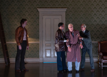 As Steppenwolf's Artistic Directors Glen Davis and Audrey Francis declare in their program notes, "To attempt a faithful description of this play is a daunting task." It is relatively safe to say that it features four men and two generations, it is set in a well-appointed British country house, and some amount of time passes. Beyond this, little is certain. The men of the older generation may be recent acquaintances or old schoolmates. They may or may not be poets. The men of the younger generation are (probably) employees of the owner of the country house, though the nature and origins of the employment are murky and contested. And, of course, all of this matters only in so far as the truths and lies and tangents give Pinter and the actors license to spend two hours playing with language. In support of that virtuosic, the production offers a thought-provoking design. On the surface, the scenic design by Andrew Boyce reads as simply attractive and appropriate. The lone set is the library or study of Hirst, the owner of the house. Boyce sets two leather wingback chairs just left of center stage, separated by a table. Two straight-backed chairs face one another at the opposite ends of the set, downstage. The only other furnishings are a handful of lamps, a sideboard with a heavy black telephone behind the leather chairs, and later a rolling breakfast cart and ice bucket stand. The stage right wall is floor-to-ceiling shelves filled with old-looking leather-bound books. There's a library ladder upstage and a mirror-backed bar recessed in the center of the shelves. The upstage wall is papered floor to ceiling in green brocade, and the stage left wall has heavy green curtains and the intermittent suggestion of a window. The ceiling has a medallion and a chandelier hanging roughly over the table. What's striking about the scenic design, which sounds utterly unremarkable in these details, is the fact that Boyce has created this set within an open-fronted box. All around this is a strip of muted gray-white that is lit with something mimicking work lights throughout the play. In effect, this suggests that these men and this language exist within a diorama or a shadowbox or perhaps an old tube television set. When the upstage door opens for the first time, as Hirst comically crawls out of the room, the blank expanse that confronts the audience and surrounds this single room is eerie and powerful. In keeping with this, although the demands of the lighting and sound design (Yi Zhao and Mikhail Fiksel, respectively) are, or at least seem, minimal, they are perfectly executed and maintain the set's productively troubling vibe. Janice Pytel's costumes have the luxury of leaning into the cutting humor and cleverness of text, and clearly Pytel delights in the opportunity. Early on, Hirst is a visual mishmash of checks, stripes slanting in all directions, and almost hidden argyle. His silk robe and pajamas do not disappoint in being absolutely correct and proper in cut, fabric and composition, and a strange disaster in their loud colors and patterns. His pin-striped double-breasted suit at the play's end completes the visual arc in its wonderful cartoonishness. Spooner, in contrast, doesn't so much occupy as coexist with his gray, rumpled suit with its jacket and pants that seem subtly not to match. Pytel is equally playful (and just as successful) in dressing Foster and Briggs. Foster's diagonally striped shirt and brown leather jacket paired with vertically striped slacks both echo and clash with Hirst, whereas the long, sleek leather coat and Cuban heels for Briggs suggest a different energy and type of masculinity altogether. These looks are well married to the characters' linked but distinct roles within the drama, as well as the actors' well-considered approaches to the dialogue. As impressive as the design is, from top to bottom, it is rightly and definitely outshone by the performances. As Hirst, John Perry embraces the silliness and physical comedy that often lands on the far side of Monty Python in terms of how broad it is, and yet he commands the room so convincingly in the character's more lucid (or perhaps temporarily sober) moments, that it is believable when the others snap to, and there are real stakes when they resist. Mark Ulrich's Spooner is a worthy match for Perry's Hirst. This is a feat in and of itself, and all the more impressive given that Ulrich only very recently stepped into the role. He imbues Spooner with an anxious, coiled energy that suggests an athletic young man straining to break free of his older self. Also noteworthy is Ulrich's relish for Spooner's filthier dialogue, which had audience members of all ages gasping and blushing with delight at the performance I attended. As Foster, Samuel Roukin both verbally and physically plows his way into the scene with a completely unexpected oddball energy. As his earliest lines tumble out, they manufacture a roller coaster moment where it seems as if the performance might be irreconcilable with those of Perry and Ulrich (with whom we spend the first long stretch of the play), only to have his take on the language, the humor, the very meaning (if any) of everything slot delightfully into place, peeling back another layer of the appeal of Pinter's absurdity. As Briggs, Jon Hudson Odom has both so little and so much to do. Briggs is the tightly wound spring to Foster's spent, sagging jack-in-the-box. Odom's body language and facial expressions, paired with razor-sharp delivery, come together to make this performance an ingredient vital to the success of a play that, even for Pinter, demands that the actors observe and react to one another with precision timing. No Man's Land runs through August 20, 2023, at Steppenwolf Theatre Company, Downstairs Theater, 1650 N. Halsted St., Chicago IL. For tickets and information, please visit steppenwolf.org or call 312-335-1650. |