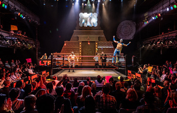 The production's successes begin with the wonderfully crafted visuals. Anna Louizos backs the full-sized ring with a gold, stepped pyramid that is just gaudy enough to play with the "low art" flavor commonly associated with wrestling without at all accepting that premise. Double doors set in the center of the base, of course, facilitate dramatic entrances by the luchadores, and the flat itself serves unexpectedly well as a backdrop that showcases both the saturated rainbow lighting design (Jason Lynch) and the arresting projections by Michael Salvatore Commendatore and Rasean Davonte Johnson. The projections combine with Michael Huey's sound and original music to imbue the story with the mythic quality that is, at once, over-the-top and ultimately moving. And, of course, the matches would be nothing without the flamboyant, functional costume design by Nicole Alvarez. From the capes to the headdresses, to the masks and base-layer costumes themselves, Alvarez's sense of individual character and visually appealing combinations is top notch. The story is cleverly designed and well paced. Each of the matches is breathtaking on its own athletic and artistic merits (kudos to wrestling coordinator Luis "Aski" Palomino, who also plays Tezca). Moreover, each match, beginning with the humiliating loss of the young técnico upstart Huitzi (Joey Ibanez) to the retiring rudo Tezca, which nearly results in Huitzi losing the mask handed down through his family for three generations, has stakes that the audience gladly gets swept up in. This vibe begins well before entering the Owen Theatre itself, as guests are invited to grab brightly colored posterboard and markers to make signs supporting their favorite luchador or simply expressing their love for the sport. Pre-show, the Maestro de Cermonia (Victor Maraña) and the Referee (Jean Claudio) whip up the crowd and offer basic guidance on when to boo and hiss, when to cheer, and when to settle to let the genuine drama unfold. In all of this, they have an assist from two camera operators (Isabella Abel-Suarez and Cisco Lopez), whose footage is projected at the apex of the pyramid, both pre-show and during the matches. Although this is all delightfully fun, it's perhaps more impressive and a testament to how smartly designed the show is that it almost seems unnecessary. The story and characters win the audience over so easily and keep them so engaged that the Comentaristas (Ramón Camín and Rinska Carrasco, who spark wonderfully off one another) are able to shade more and more into exclusively Spanish dialogue and little or nothing is lost. Among the luchadores, Coyo (Paloma "Starr" Vargas, a legitimate Chicago pro-wrestler) rules the ring with her tremendous presence, the conviction of her moves, and her command of the mic. She and Ibanez match well with one another as reluctant allies, an awkward tag team, and ultimate enemies, with Ibanez doing well to sell both Huitzi's young punk phase and his eventual growth. Although the audience primary sees Quetza (Molly Hernández) in video clips where her voice is modulated, her dead-eyed stare is arresting, and her match with Coyo is among the most engaging. LUCHA TEOTL runs through October 29, 2023, at the Goodman Theatre, Owen Theatre, 170 N. Dearborn, Chicago IL. For tickets and information, please visit GoodmanTheatre.org or call 312-443-3800. |