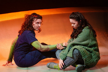 The story is set on Kinnan Island, a community whose slow death is poised to be hastened along by an offer from the government to relocate the dwindling number of remaining residents to the "Big Land." Eilidh, the island's only remaining child, lives with her grandmother and grudgingly maintains a FaceTime relationship with her mother, who departed the island after its lone school closed to seek work on the mainland. In her wanderings on the beach, Eilidh comes across a beached whale calf whom she sings to as it is dying. Later on the same beach, she comes across a strange and traumatized girl, Arran, who turns out to be one of the legendary Finfolk. Viewing herself as responsible for the death of the whale, who had been her charge, Arran turns out to have fled her people out of guilt and shame. The girls work their way through their mutual loss, grief, and relationship to a shared myth, and buoyed by unexpected new life in their communities, both ultimately make a start on repairing the significant relationships in their lives. The costume design by Hahnji Jang is simple and functional. The actors' shifts from one role to another is accomplished through performance, yet it's important that the costuming not contradict or complicate any of these transformations. Eilidh wears a cabled sweater jacket, much mended, that is as believable on a girl as it is on the heavily pregnant Breagha. Arran's navy jumpsuit unzips to reveal a rather girlish striped sweater beneath when she and Eilidh meet, but otherwise it serves as a neutral background for characters as varied as Eilidh's Gran and a marine biologist who has recently come to the island. The scenic design by Emma Bailey is similarly quite minimal, just a single set piece resembling a wide-rimmed bowl tipped so that it is high upstage and the "rim" appears buried in the sand downstage. The differences in height, paired with the performer's skillful physicality, suggests rocky terrain descending to the sea. The white material is readily transformed by way of Simon Wilkinson's lighting design to suggest the sea, Eilidh's home, a tiny radio station, and so on. Wilkinson's lighting is also starkly impressive during the storm that marks the play's climax. The sound design by Sam Kusnetz (Finn Anderson is credited with the loop station's sound design) is the obvious third star of the show. From the time the audience enters the space, there is a low, constant tone that only becomes obvious when it is suddenly withdrawn. It's a powerful means of shifting attention all at once to the harmony, percussion, and sounds the performers begin to create from the show's opening number. There are one or two instances where the relative volume of elements obscures dialogue or otherwise nudges the narrative to the background in a way that is frustrating, but on the whole, the sound in tight sync with the lighting and the performers' movements transports the audience to an altered state. Although the run-time is only about ninety minutes, the demands the show places on the actors are considerable. It makes sense, then, that it has two casts who alternate nights. At this performance, Lois Craig played Eilidh and Julia Murray played Arran (Sylvie Stenson and Stephanie MacGaraidh, respectively, play the roles on alternate nights). Both have positively exquisite voices and unfailing technical skill. The show often calls on each to enter into a number a cappella or to rapidly establish a rhythmic element immediately following a dramatic scene. There is no room for error and unwavering mutual faith is critical. Craig and Murray deliver on both fronts, and the deep, necessary bond between them adds an electric charge to what is already a highly emotional affair. Moreover, their acting is also stellar and just as mutually supportive. Whereas Craig is able to establish Eilidh, as she plays her alone through much of the early parts of the play, Murray's multiple roles as Eilidh's mother, her Gran, and Jenny, the marine biologist with whom Eilidh longs to form a connection, help the audience to learn about Eilidh and her circumstances. Once Arran emerges, the dynamic is reversed. Craig shifts between characters as Arran is gradually revealed. The end result is not just a pleasure to watch in terms of appreciating their craft as actors, the two genuinely create a fully realized community to support the narrative. Islander runs through December 17, 2023, Upstairs at Chicago Shakespeare Theater on Navy Pier, 800 East Grand Avenue, Chicago IL. For tickets, visit www.chicagoshakes.com or call 312-595-5600. |