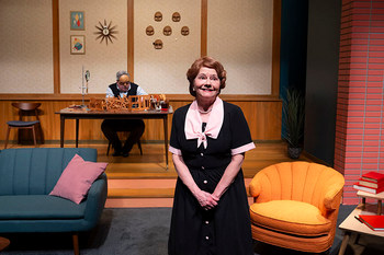 This is not a period piece, though, despite that design. Or, if it is, the period is undefinable. Darren and his wife Edith (Linda Reiter) are costumed for an earlier era, to be sure, and they relate to each other as if they were in one of those shows, but when their grown children appear (Carl Collins and Sarah Patin play Darren Junior and Edith Junior respectively), they could have been plucked right out of today's world. (In fact, one of the Edith Junior costumes designed by Yvonne Miranda is fairly futuristic.) And the rain that is causing consternation for them–as well as anyone else not living on the 19th floor of a high-rise–seems to be the end-of-the-world variety. The elder Darren and Edith, of course, live on the 19th floor, where they enjoy their view of the ocean coastline and the shops below them while Darren works on his project and Edith wishes he would finish so they can finally have tea and then work through the myriad red volumes containing "unanswerable questions" that have come up as he has worked on it–and which Edith has dutifully recorded in their pages. I mentioned that this is absurdist, right? Well, in addition to the otherness of their parents' relationship, those modern children call their mother (and she answers) on phones made from tin cans and string. The younger Edith and Darren live in their own apartments on some lower floor in this same building–so they have a much clearer view of the water rising in what has become a never-ending rain. Edith, on that 19th floor and bizarrely looking out those windows to see sunshine, doesn't take them seriously. Darren, who thinks of them as spoiled lost causes, certainly doesn't either, even when the storm rages more fiercely and we see it streaming in a projection on the wall behind him. This could be a play about climate change, and I suppose to some extent it is, since it is heading toward a Flood that can only be called Biblical. But Deen is much more interested in the human elements here: the intergenerational relationships; the lack of any meaningful connection between the elder couple; Edith Senior's almost desperate desire to make tea for her husband, who is always there but makes no attempt to take part in her world. The tea he constantly postpones would be a real connection, and his life is so full of failed connections that he will not risk another until he has finished his "masterpiece." (Said masterpiece, when he finally shows it to Edith and to us, turns out to be extremely ironic on multiple levels.) Ward and Reiter create a dynamic that is completely recognizable, if not realistic. He is the Man and she defers to him on everything, even when she can see out those windows that he is ignoring something important, even when she finally understands that her children might be in real trouble, that they might be in real trouble. But Darren is fully occupied with his creation and unable to see past the wooden mask he wears. The only changes that occur in their world are the occasional moments when several of the books suddenly fall from the shelves, a foreshadowing of the (fairly obvious) fact that these two will never get around to discussing the answers to their questions. Flood is directed by Kenneth Prestininzi, who allows such a slow build that I almost started believing, near the start, that the play would be silent, like an old movie. (Edith standing near Darren's table with her anticipatory teapot is a very early symbol of these two stationary ships passing each other in the night.) Deen's play is a kind of Waiting for Godot for modern relationships: even if its protagonists ever connect, it would ultimately mean nothing. Flood, a Shattered Globe Theatre production, runs through March 9, 2024, at Theater Wit, 1229 W. Belmont, Chicago IL. For tickets and information, please visit sgtheatre.org. |