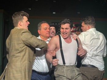 Gwydion Theatre Company, according to its artistic directors Grayson Kennedy and Tommy Thams, is a group whose goal is to "produce subversive and politically charged theatre." To that end, they have chosen as the first play of their inaugural season here (after forming in Los Angeles), Clifford Odets' 1935 union classic Waiting for Lefty, a play that directly takes on income inequality, uncaring bosses, and underhanded union-busting tactics. Watching it is a kind of time travel–the play is set in the early years of FDR's first administration–but the frustration and anger these workers and their wives feel with the status quo could be ripped directly from today. At a moment when the greed of big corporations is artificially keeping prices high despite the efforts of our current administration, it's sadly easy to understand those emotions, and Gwydion's production holds them in the spotlight. Directed by Kennedy, who also designed the minimalist set, Lefty takes us to a New York union hall full of disgruntled taxi workers. After they enter a vista in groups of two or three, we find ourselves in the middle of a meeting. Fatt (Rick Yaconis) is desperately trying to keep control as many members are calling for a strike; he is trying to get them to see that, with a new Democrat in the White House, this is not the best time for such an action. The room, however, is all in a dither: everyone is talking over each other and no one is in the mood to listen to what Fatt has to say. Moments later, Odets begins to show us the reasons for this in what becomes a series of breakout scenes illustrating the individual reasons these people are frustrated. Kennedy, who carefully sets the meeting facing the upstage dais so we get the members' perspective, places these close-up moments in the middle of the stage, where there are no furnishings. The first couple we meet leans into that: Joe (Andrew Shipman) and Edna (Maddie Hillock) have just had all of their furniture repossessed; times are very tough for taxi drivers. From the moment we meet Edna–smoking on the floor of a darkened living room–it is clear that she is angry, both at the union for not striking and at Joe personally because he is not bringing home enough to feed their family. (She tells him to be careful not to awaken the children because she put them to bed early so they would not realize they had missed a meal.) He tries to make the same lame excuses Fatt was making at the meeting, but it's no use: Edna claims that she is ready to leave him for an old flame if he doesn't stand up for himself. Shipman and Hillock are on fire in this section, and their argument (which is far longer than the part of the meeting we saw, a pattern that holds true throughout the play) lets them each verbally assail the other, but both actors hold enough in reserve to allow us to understand that it is their frustration speaking and that these two actually still love each other. When we return to the meeting, Joe is at the podium just finishing a speech which he concludes with "We gotta walk out!," so it's clear that his wife's energy has now transferred to him. The tough times are also affecting a younger couple, Sid (Bobby Dixon) and Florrie (Ellory Jezuit). Florrie's brother Irv (Caleb Petre), her self-appointed guardian, argues with her that times being what they are she can't set her hopes on Sid, who can't seem to jump start his career as a taxi driver. Florrie and Sid, though, have been engaged for three years waiting for some money to start coming in so they can marry; sadly, their love coincided with the beginning of the Depression, which shows no sign of ending, and Sid has made up his mind to let her go for her own sake. Dixon and Jezuit, in another lengthy scene, go through many similar beats to what we saw from Shipman and Hillock. All four actors are extremely strong, though their plots run in diametrically opposite directions–whereas Hillock's frustrated anger is so overwhelming as to win her argument, Jezuit's deeply felt young love, well performed in moments both serious and comic, isn't enough to hold things together: we see the depth of love in all of them, but starting out in this economy is simply too hard. Kennedy's directorial style allows the actors to give in to extremes of emotion, even speaking over each other, and the couples' scenes hold nothing back while unseen union members watch from the "hall"; at times, he will give them free rein to throw ad-libs into the energy of the moment we are seeing. Whether they do or not, though, they are always intently watching. These men know why a strike is needed: each has a story like these to tell. Though it is clear that a strike could fail, they have to try. Other scenes illustrate the lack of caring from the owner class: A hospital decides to close an entire wing and cut staff not for medical reasons but for economic ones, apparently not worrying about the impact this will have on patients and employees. (We even hear about one poverty-line patient who dies during a fairly routine surgery because the powers that be won't shell out the money to keep their best surgeon, allowing a third-rate–but far cheaper–hack to do it instead.) We also see owner class decisions that are morally dubious for non-economic reasons: a highly regarded young worker refuses to take a promotion that, though it involves a raise, would have him spying on an esteemed doctor he'd be working with ... and making poison gas. He quits instead, joining the men at the union hall who are demanding more from their bosses. As for his own boss, he boils down the opinion of his class perfectly: ignoring all humanitarian arguments, he tells the young man that "if big business went sentimental over human life there wouldn't be big business of any sort." Is it any wonder that Odets'–and through him our–sentiments are on the workers' side of things? For the most part, this is a very well-directed show, the breakout scenes s