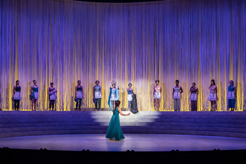 Originally published as a novella and only later as a play, Atwood has described The Penelopiad as a cabaret in the same vein as works by Weil and Brecht. Much of the play, though, is a monologue delivered by Penelope from the afterlife as she contemplates the fact that, even as they seek to elevate her name, storytellers reduce her to a single word: loyalty. She also reckons with the recriminations of the twelve ill-fated maids whose help she enlisted in her plot to stymie the suitors eager to hitch themselves to the presumed-widowed Queen of Ithaca. Penelope's version of her own story is wry, bawdy, funny, petty, and filled with both horrifying peaks of violence and violence so wearying and constant that it fades into mundanity. It is thoroughly a woman's story and, on the whole, engaging and well-told. Music and dance are woven in among the monologue and brief dramatic scenes, constituting the "cabaret" elements Atwood has referred to. Although dance (choreography by JoAnn M. Hunter) is stunningly conceived and executed, the music doesn't work as well (or perhaps it is not as consistently a value add), at least in this production. Samuel Davis's compositions are quite varied in style and all are short, making them rather difficult to enter into or connect to the specific scenes in which they appear (though one piece that calls on the maids to sing in chorus is quite beautiful and moving). The accompaniment is recorded (Jeremy Ramey, music director) and not particularly easy to hear. In one early instance at the opening night performance, two of the singers, both clearly talented and capable as evidenced by later songs, seemed to have difficulty hearing it and wandered somewhat off key. The visual elements of the production are impressive and contribute considerably to the spell the play casts. Neil Patel's set design suggests white amphitheater steps curving from wing to wing, backed by a curtain of white strips hanging from the theater's ceiling to the top step, making for excellent shadowplay and dramatic upstage entrances. The few other set pieces include Helen of Troy's bathtub, Odysseus and Penelope's plot device of a marital bed, and the mounted row axe heads through which Odysseus shoots to prove his identity. Each of these capably conjures up a familiar scene or the necessary vibe and is easily whisked offstage after it has served its purpose, bringing us back to the ambiguous void of Penelope's afterlife. Patel also offers two versions of Penelope's loom, one relatively realistic and its enormous counterpart, which drops in from the ceiling, comprising aerial silks that several of the maids navigate acrobatically as the women conspire against the suitors. The lighting design by Xavier Pierce has tremendous fun with Patel's set, particularly, the curved "curtain," as he transports the characters and audience from the sea to to the ominous, shadowy corners of the court, to the intimate confines of Penelope's chambers. The playful fluidity of the set and lighting extends to Kara Harmon's costumes. For Penelope, Harmon plays things fairly straight with an ankle-length grecian gown in deep blue-green to suggest the character's half-naiad heritage. For the maids, the color palette ranges from green to rose, to blue, and Harmon makes the interesting choice of using an athletic-wear baseline silhouette while allowing for considerable variation in the style. As the women playing the maids step into and out of the play's other roles, Harmon adds a babydoll dress here, a shawl there, and a hoodie or a surcoat to signal a masculine character. For the suitors, she adds grotesque, fleshy padding that simply ties on to different parts of the body. The overall effect is a wonderful balance of clearly careful planning and coordination with genuine creativity and wicked humor. Morrison has appeal for days in the lead role. The play hits the ground running with sharp, cutting wit from the get go, which she handles with admirable timing. She also pulls off Penelope's adolescent fear of a hasty marriage with real tenderness and dives in fearlessly to the character's less admirable qualities, from her low-key but unrelenting irritation at everyone's obsession with her cousin Helen to her oblivious entitlement to the sacrifices she demands of the maids. Her weary (and wary) reunion with Odysseus feels true to a woman who has been surviving by her wits (and by her ruthlessness, as needed) for years. Each of the other actors (Aja Alcazar, Demetra Dee, Maya Lou Hlava, Noelle Kayser, Elizabeth Laidlaw, Helen Joo Lee, Tyler Meredith, Ericka Ratcliff, Andrea San Miguel, Laura Savage, Allison Sill, and Hannah Whitley) is credited as "Maid," regardless of other roles they take on. All give thoughtful, palpably human individual performances, and their absolutely seamless trading off of words within the same line of dialogue is tremendously effective. The Penelopiad runs through March 31, 2024, at the Goodman Theatre, Albert Theatre, 170 N. Dearborn, Chicago IL. For tickets and information, please visit GoodmanTheatre.org or call 312-443-3800. |