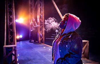 Suffice it to say that, in Shattered Globe's Midwest premiere of the play, directed by AmBer Montgomery, not everything is going to make sense for a while. In fact, you could be nearly halfway through its 90-minute run time before Simpson's stunning reveal allows you to really start to understand what is going on with these characters. Long before that, though, it is clear that something is not normal here, even given that these characters are here to clear out and sell a house where the two sisters grew up–after their mother's protracted death from cancer has brought the whole family to the edge of despair and reduced the father to a drunken shadow of the man he once was. Amazingly, given all that, Simpson is able to ground the play in a sense of humor, which Montgomery plays for all it's worth. Scenes in the sisters' childhood bedroom, as they clear out the detritus of two lives, are poignant but also hilarious and rife with earned laughter: not a mean feat. And the aforementioned bridge scenes between younger sister Fay (Jazzma Pryor) and the would-be jumper she runs into one night–she just might be the reason he doesn't go through with it–take that suicidal overtone and bury it as easily as these two stun each other and themselves with their dance/singalong. Despite his suicidal bent, the guy on the bridge, Hopkins (played by Jeff Kurysz), is an emotional open book compared to Fay, who has so much churning in her head that she starts to believe she actually has a brain tumor–and maybe she even wishes she did: it might be easier than dealing with what her life has dealt her. Hopkins is almost bizarrely serene about his desire for death, while Fay–whose recent life has been framed by it–is just trying to find a way to make sense of things. Befriending Hopkins, and realizing that he comes to the bridge often, she gives herself something to look forward to. Kurysz's character (aided no doubt by Rachel Lambert's wonderful choices of costumes for him) might be labeled "eccentric" if not for its essential grounding. This is a man who doesn't want to be suicidal even if his mind is telling him to be, and Kurysz plays Hopkins' slow realization of this truth beautifully. Fay's behavior is far more out of control. She is a woman whose family has been worrying her about for years, and a sudden death (from drugs, from suicide) wouldn't have even surprised them. But Pryor's performance is not as out of control as her character. She shows us from the outset that she is trying as hard as she can to understand and deal with the current chaos of her existence, even if she can't figure out the crackling lights. As her older and apparently more settled sister Judy, Jennifer Glasse brings us along on a trip down memory lane: jumping on her old bed (instigating the aforementioned laughter) while Fay sorts through some old belongings. Glasse captures the necessary dichotomy of her character: she is currently calm and fairly complacent while understanding the turmoil of the past. Perhaps laughter is the only real way to deal with something like this. As the girls' bereft and mostly drunk father, Alfred H. Wilson's Dad has opted out of any sense of reality and responsibility. Even before he arrives onstage, the girls comment about how poorly he has dealt with tragedy, and it is instantly clear that they are right. But Wilson (and Montgomery) don't allow that to be everything that defines his character. We see that he is mightily struggling, and we hear him make totally awful statements to Fay, the daughter he has never loved as much, but Simpson ultimately allows an arc of, if not quite redemption, then at least understanding. As to Pryor, whose Fay is the center of the play, her performance is an absolute revelation. She breathes life (and copious vape smoke) into a horrifically broken woman and somehow never ceases showing the potential strength within all of the fragility. She morphs her performance depending on her scene partner: with Wilson, she is on guard and always on the verge of anger; with Kurysz, she allows herself to become inquisitive, introspective, and more caring than she ever gets with Dad; with Glasse, she is able to bring out more unbridled pain amid the nostalgia of the moment. And in her moments alone on stage, we can glimpse the inner confusion that controls Fay, whose fantastical hallucinations signal someone who is desperate to escape current reality even as her increasing desire to help Hopkins becomes more and more clearly about a desperate need to save someone. The bridge itself so dominates the set design by Lindsay Mummert and Regina Garcia that several of the seats in the small house have to be labeled "obscured view" because its girders and walkway prevent a clear look into the bedroom set; its designers clearly understand its vital importance to the piece. The bridge, we are told often, is a focal point of the view from the house; in fact, it was a primary consideration in the parents' decision to buy it. Fay's clearest early memory is of her mother taking the sisters to walk its majestic span, and everything in the play pretty much revolves around it. It is a symbol both of permanence and impermanence, as dichotomous as the emotions of the characters. (That early moment when a potential suicide becomes a vibrant and celebratory dance highlights its powerful nature.) In addition to the set design, Montgomery is fortunate to have other excellent designers, including Levi Wilkins, whose lighting is sometimes spectacular–look at the photo above–and sometimes, as in the bedroom, just exactly right for evoking childhood memory. Other key designers include Chris Kriz, with his original music and sound design (especially that mysterious crackling); Jamie Auer, who has managed to find the perfect props and set dressing to ground the story; and Lambert, who outdoes herself on Kurysz's costumes but whose less outlandish work with the others is equally admirable. Jump is