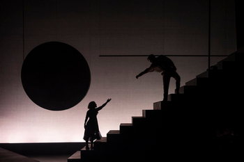 There is a dreamlike, Chagall-like feel to the play, even to the point of using a blue prop fish as a stand-in for their baby daughter Ida. (Chagall famously used surreal animal imagery in his paintings.) Ian Ross's music, performed by ensemble actors and multi-instrumentalists Elisa Carlson and Michael Mahler, has an often haunting flavor of Russian Jewishness that keeps the Chagalls' heritage in focus even when it isn't. However, in a show that takes place during World War I, World War II, and the Russian Revolution, it is usually front and center anyway. The play is set up as a flashback taking place when Chagall, who died in 1985, is an older man living in America with his second wife Vava, whom he married after Bella's death. (We don't meet Vava; this play is about his relationships with the first woman he loved and with his art.) At its start, the artist is just beginning to have some success, mostly through sales in Paris, while Bella awaits his return in Vitebsk. (One scene shows her long boring days alone even after that return. Though there is never any doubt of the depth of his love, she comes off as fairly amazing for holding onto hers through this very lonely and difficult times.) Cahill-Lemme and Rosenthal are perfect as the lovers. Margolius' carefully defined movements entwine them in a series of gorgeous positions, using Scott Penner's set to provide variety. Both actors, who exude the unquestioning love of youth even later in their characters' lives, hardly take their eyes off of each other when they are together, gazing deeply as if memorizing features. As they move about that set, making much use of its long ramp (though much less of the towering staircase dominating the upstage space), it is easy to see that they are utterly inseparable even when far apart. The backdrop of the set includes a large moonlike cutout section that lighting designer Charles Cooper outlines in various shades, as well as some excellent uses of rope lights. Add to that Willow James' multilayered sound design and Rachel Lambert's lovely costumes and this is one of the most beautifully designed and realized plays I've seen in a while. As for the title, well, unlike various people and animals in Chagall's paintings, the lovers here don't actually "fly." They do use a floor to ceiling pole to simulate not being confined by gravity, though, and their dance movements throughout the show involve a considerable amount of gorgeous movement that comes close to flying. I walked into this play not knowing what to expect, and I was blown away by its beauty as well as its story. Having seen his work often in the Art Institute, I have always loved Chagall's painting. I also knew the story of his being removed–he says "expelled"–from the school he had founded by members of a rival artistic branch. However, I knew nothing of his wife and their deep love, nor her writing. Knowing that now gives much more meaning to his powerful imagery. Chagall was a man with enormous emotions whose life was lived at the intersection of art, love, religion, and politics. And despite powerful forces at work in the world, his art and his love proved dominant. (Even the Nazis are bit players in his story.) I'm feeling the need to go to the Art Institute again so I can immerse myself in his gift, and I think that this reaction would please both the Chagalls and the cast and crew of this play enormously. The Flying Lovers of Vitebsk runs through October 6, 2024, at Northlight Theatre, 9501 Skokie Boulevard, Skokie IL. For tickets and information, please visit northlight.org. |