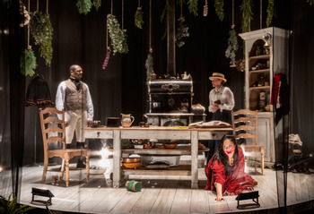 The story unfolds over the course of a Midsummer Evening and the following morning. Kristine and Jean, both servants to the Count, are engaged. Although Kristine embraces the social order and her role within it, Jean is both anxious to elevate his own status and fascinated by the daughter of the household, Miss Julie. For her part, Miss Julie has just recently either suffered a broken engagement or broken it off herself, depending on whose version of events the audience is to believe. Either because it is in character for her or as a reaction to the dissolution of her relationships, Miss Julie inserts herself into the servants' Midsummer festivities, dancing with various members of the staff, and particularly with Jean. She pursues him as he returns to the kitchen and, after copious drinking and verbal sparring, the two end up having sex and destroying the kitchen in the course of it. Before sunrise, they come to their senses sufficiently to realize that, despite their mutual desire to break out of the social classes that constrain them, their liaison has simply destabilized their statuses, stripping them of whatever protections they might have had without actually altering where they fit within this rigid reality. Kristine returns long enough to resolve to leave the household, as she sees Miss Julie as having irrevocably debased herself, and to thwart Jean and Miss Julie's half-formed, cynical plans to flee the Count's household before their secret can be discovered. Strindberg's original ending is abrupt and ambiguous, with Jean "ordering" Julie to leave the house, presumably to kill herself. Court's version takes this a step further, having Jean cut Julie's throat, only to see her "rise" and seemingly mix herself the abortifacient tea she'd had Kristine brew up earlier in response to her personal dog "mixing" with the barn dogs. John Culbert's scenic design is quite gorgeous and captures the paradox of the dreamy, liminal temporal setting and the close confines of the "downstairs" spaces of a grand home, but it has limitations in terms of how functional it is. The irregular, naturalistic footprint of the stage is enormous, as the thrust pushes well past what becomes the proscenium in other productions. But much of that space is given over to plants and the suggestion of water surrounding the circular space of Kristine's kitchen, which is enclosed in a floor-to-ceiling net that evokes the cage of the greenfinch Julie is intent on bringing with her as she flees her father's home. This space is almost exclusively where the characters interact. It is crowded with a huge, old-fashioned stove, a large, sturdy table, and various shelves. Although this cluttered, claustrophobic feel is certainly appropriate to the space servants such as Kristine would occupy (and more broadly suggests how little opportunity for agency any of these characters as), it leaves the actors very little room to move in, particularly after multiple instances of characters knocking various kitchen items to the floor. Throughout, the actors often either trip over these or find themselves having to kick out of the way. Moreover, the floor itself is often quite distractingly loud, particularly as Miss Julie scuffs along in the flat sandals she's donned to complete her "commoner" look for the festivities. Raquel Adorno's costumes work well with the impressive visuals of the set. Miss Julie's flowing white peasant dress, with its red accents and soiled hem, reflects the gender and class confusion of the character's upbringing. In contrast, what Kristine wears when she is on the job is functional, but meticulously neat and clean, whereas her Sunday clothes are smart but understated, as befits a woman who not only accepts her place in the social order, but embraces it. For Jean's part, it is drily funny to see the lone male character as the one who struggles into and out of various prescribed costumes. Moreover, the baseline of white breeches with braces and a white undershirt suggests the man's tendency to think of himself as a blank canvas, always ready to paint himself (or be painted) in some new light, as the situation demands. Keith Parham's lighting and particularly Willow James's sound are uncharacteristically weak in this production. Parham's more traditional lighting, which prevails for most of the show, is effective on the whole as it moves the action along in "real time." But the "bird cage" part of the set is surrounded individual bulbs, set in a grid. At a handful of points, including the opening, during the sex scene, and nearer the end of the show, these flash in sequences reminiscent of a rock arena show. These moments are paired with loud, abrasive techno music that seems an odd choice, given the play's reputation for being the height of naturalism. At the top of the show, there is a stretch of this music and strobing lights that goes on far too long, as Kristine quite literally goes through all the steps necessary to create a bread dough and do the initial knead and punch down of it before setting it in the warming oven. This music then pulls back until there is just the faintest suggestion of thumping bass that runs throughout most of the rest of the show. Although it seems intended to evoke the party going on in the barn, the sound level is so low that it seemed for a long time that it was simply bass-heavy music playing not in the theater, but somewhere nearby. Whatever the intentions might have been for this sound design, it simply doesn't land. In terms of the performances, all three actors give good performances, but the direction does not quite gel. As Miss Julie, Mi Kang is dreamy, frantic, and ferocious by turns. Kang is unafraid to own the fact that the character is self-involved and dabbling in the world of Jean and Kristine in ways that are oblivious and dangerous to them. Yet she finds moments of vulnerability that keep the character from being entirely unsympathetic, which is an accomplishment 