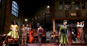 The set, designed by Linda Buchanan, sharply and succinctly conveys the various power dynamics within the story. The design hollows out the Goodman's Albert Theatre all the way to the rafters, doing away with the proscenium to create a three-level design that situates the white characters, Irving and Sturdyvant, largely in the control booth at the top, Ma and her immediate entourage in the recording studio itself on the middle level, and the men of her band in the basement rehearsal room. Buchanan also inserts the city into the structure of the set. Downstage right is a small wooden platform with a few wooden crates that seems intended to represent a Chicago street, and above the band room, upstage left, is a brick wall that rises all the way to the ceiling. Occasionally, characters race from the wings on to this street, and the stark shadows of the city appear on the face of the brick, but these aspects of the set are somewhat underused and the narrative purpose of the specific moments when the lighting (overall a very effective and emotionally evocative design by Jared Gooding) and sound cues (sound co-designed by Michael Bodeen and Rob Milburn) call attention to the city is not always obvious. On the whole, however, the set design, sound, and lighting come together effectively to interweave the complex stories playing out on multiple levels, both literal and figurative. Evelyn Danner's costume design makes strong contributions to this success. Her design for Ma strikes the perfect balance between flamboyance and attention to class. Dussie Mae's look speaks to Ma's in terms of its material and color palette, but the cut has a girlishness to it that productively complicates the character's sensuality. Similarly, Sylvester's outlandishly smart outfit reflects Ma's aspirations for her extended family and offers the actor (Jabari Khaliq in a very strong performance) opportunities to assert himself as a man and as an individual against the backdrop of this visual comedy. Danner's work for the men in the band is subtler, but effective, as Cutler and Slow Drag almost seem to be in uniform, whereas the wardrobes for Levee and Toledo convey that the two embody distinct worldviews that exist in tension with one another. The performances are uniformly strong, though there are instances in which the intentions of directorial choices are not entirely clear. For example, E. Faye Butler is wonderfully brash, abrasive, and commanding as Ma Rainey, and her singing voice is sculpted to match this characterization. However, the performance seems weighted toward the shouty, diva-ish end of the spectrum. Obviously, these characteristics are integral to the character, but Wilson's text is seeded with moments that reveal her dedication to family and the ways in which a lifetime of exploitation by the industry and violence at the hands of society at large have created the diva. The moments that Butler finds, in particular with Sylvester, show that she is more than capable of cultivating this nuance, but Smith's direction seems inclined to deemphasize these. One possible explanation for this may be the production's approach to the character of Dussie Mae. Tiffany Renee Johnson's performance is effectively seductive, and there's an interesting assertiveness to her take on the role that is not typical. One might read this as an attempt to bring to light the kind of formative experiences that Ma might have had as a younger woman. The possibilities inherent in this approach are intriguing, but it doesn't quite land, as the danger inherent in the dalliance between Dussie Mae and Levee is somewhat neglected. Al'Jaleel McGhee is riveting as Levee from his first entry on to the scene. The manic excitement McGhee conveys is both electric and menacing. This not only foreshadow's the play's ending, but also establishes the complicated field of relationships within the band. McGhee's performance sets up David Alan Anderson's weary yet cantankerous performance as Cutler and affords Anderson the opportunity to be calm and lazily charismatic in his own right without compromising the believability of his eventual eruption into violence when Levee's lashing out pushes him too far. As Slow Drag, Cedric Young effectively acts as a balancing force and the required comic relief, without ever coming across as a two-dimensional, mechanical aspect of the cast. On the contrary, in Young's hands, Slow Drag's apparent simplicity reads as being just as calculated as the splashier approaches to masculinity and Blackness that Levee and Toledo adopt. As Toledo, Kelvin Roston Jr. offers a performance that is minutely, maddeningly, and almost completely unintentionally calculated to provoke a character like McGhee's Levee. Roston deftly handles the dialogue and manages to convey Toledo's quasi-philosophical meanderings as a believable blend of rehearsed, deep-sounding factoids and genuine, off-the-cuff contemplation of what he and his bandmates are doing, can do, and ought to be doing given the world that they inhabit as Black men. As Sturdyvant and Irvin, respectively, Matt DeCaro and Marc Grapey capably lend the production a necessary layer of white hostility toward the artists they are eager to exploit. Both actors handle the required blend of obsequiousness, frustration, and condescension without veering into overt villainy. The end effect of these measured performances is ultimately more chilling, depressing, and relevant than anything more heightened. Ma Rainey's Black Bottom has been extended through May 3, 2026, at the Goodman Theatre, Albert Theatre, 170 N. Dearborn, Chicago IL. For tickets and information, please visit GoodmanTheatre.org or call 312-443-3800. |