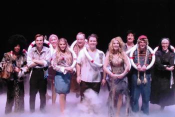 Disaster! combines plot elements and themes from various 1970s disaster-based movies accompanied by songs of the era. At the story's core is the opening of a new floating casino in New York City which is beset by various calamities, despite the warnings of a scientist. Throw in several romantic entanglements, a dim-witted lounge singer, a crooked ship owner, a nun with some secrets, and a down-on-her-luck disco diva, and it's the recipe for lots of funny moments. The show opened on Broadway in 2016, following two Off-Broadway runs. The musical comedy was written by Seth Rudetsky and Jack Plotnick, based off an idea by Rudetsky and Drew Geraci. The plot is intentionally formulaic, silly, and deliciously funny. The characters and situations are outrageous and familiar, especially if you remember any of those disaster films. The disasters which take place include an earthquake, tidal waves, explosions, floods, shark attacks, and more. The choice to have songs from the 1970s serve as the score for the show makes it all the better. The fact that the songs, often interspersed with dialogue pertaining to the plot, fit into the story adds to the amusement of the overall concept. "Hot Stuff," "I Am Woman," "Still the One," "Three Times a Lady," "I Will Survive," and "Knock Three Times" are just a few of the more than twenty songs from the decade used in the show. La Comedia's cast is a talented one. Digger Howard brings the right dry and serious tone for scientist Ted, and sings very well. Andy Donnelly (Chad) and Mallory Georgia Maire (Marianne) portray a previous engaged couple who unexpectedly run into each other on the ship. They get some of the juiciest '70s power ballads in the show and are great vocalists. Kari-Lee Sutherland captures the tender-hearted though dim nature of singer Jackie, and Madelynn Glenn skillfully and hilariously flip flops back and forth as Jackie's twins Ben and Lisa. Ayanna Lewis is funny as diva Levora and sings up a storm on a number of disco hits. John Dorney (Maury) and Tonya Oslack (Shirley) have great chemistry as an older married couple, and Ms. Oslack delivers lots of laughs thanks in her big act two moments ("A Fifth of Beethoven"), which must be seen to be believed. As Sister Mary Downey, Alison Moore provides both the dead-pan and over-the-top antics perfect for this very humorous role. David Thomas (Scott), Chris Kramer (Tony), and the rest of the cast provide worthwhile portrayals as well, and show themselves to be strong singers, dancers and actors. Director/choreographer Chris Beiser delivers the perfect balance of campiness and playing it straight for this ridiculous story, as well as solid blocking and pacing throughout. His many dances delightfully capture every flavor of the 1970s. It felt like the audience took a bit of time to understand that this was a spoof, but once they did, the laughs started pouring out. The uncredited set design centers on a double staircase with several smaller modular pieces. The limitations of a dinner theater make some of the scene transitions a bit slow, but the overall design is suitable for this show. The costume design by A.T. Jones is similar to that of the Broadway production, and is fun and period appropriate. Geoffrey D. Fishburn's lighting is capably rendered and includes some groovy disco effects. Disaster! is not yet a known commodity to many theatergoers, but it's a clever and comedic romp, especially for adults. La Comedia has assembled a talented cast and effective direction and dances. Audiences should give in to the spoof elements and enjoy the show, along with the hot stuff served as part of the tasty buffet. Disaster! runs through November 3, 2019, at La Comedia Dinner Theatre, 765 W Central Ave., Springboro OH. For tickets and information, call 800-677-9505 or visit www.lacomedia.com. |