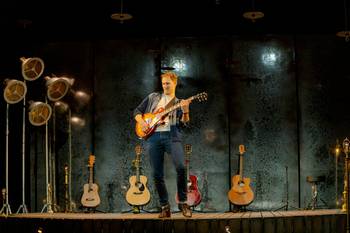 The single act, about 75 minutes, features 16 songs with bits of narration to thread them together. Alexander-Taylor takes the focus on Simon Kenny's minimalist stage, perhaps reminiscent of a coffee house with a small, raised platform. His co-stars are an array of five guitars he uses to perform Scheuer's revelatory songs, and thanks to Andrew Johnson's immaculate sound design, every lyric sung by Alexander-Taylor can be grasped and appreciated. That's kind of remarkable since the actor is something of a guitar monster, showing breathtaking proficiency on everything from old-school instruments such as a 1929 Martin O-18 to a wailing electric Les Paul Goldtop Deluxe. He could put on an instrumental recital that would dazzle most audiences. But he's onstage to tell a story about a young man's evolution from a devoted child to an angry young man and beyond. We begin with "Cookie-tin Banjo," about a homemade instrument Ben's father Rick made for him. Each song illustrates a stage of Ben's life, from "Three Little Cubs" as Rick relaxes with his three sons–Ben, Adam and Simon–to "Saint Rick," Ben's sarcastic electric-guitar elegy for his late father. At age 10, Ben wanted nothing more than to learn to play folk songs like his dad. When he's playfully asked, "What makes a lion a lion?" Ben struggles to answer, finally suggesting "his roar." It seems there should be more, and Ben is confused by his father's increasingly stern demeanor. Degrees from Harvard and Columbia and a career in academia have drawn Rick away from a satisfying life as a musician, and parenthood seems to have become a burden. Ben became the unwitting target of Rick's angry frustration. At age 14, Ben's own frustration boils over, leading him to write a terse note to pin to Rick's bedroom door, renouncing "the kind of man that I don't want to play music with, the kind of man I don't want to be." (He sheepishly admits, "I was a very dramatic 14-year-old.") The Lion navigates smartly between disarming remarks like that and songs that reveal deeper emotions. Ben is riddled with guilt when Rick dies unexpectedly. His mother leaves New York City with her sons to live in London, but Ben becomes increasingly distant, even when Simon and Adam pursue music, too. Ben returns to New York and meets Julia, whom he woos with an unusual lyric: "You make me laugh with your impression of a friendly pterodactyl's mating sound." She inspires him to return to acoustic music. But their relationship, initially full of promise, sadly goes off the rails. She tells Ben he's "the loneliest person I know" as she goes off to tour the world–and never return. Then he's struck with a life-threatening illness. This might all sound a tad maudlin, the tale of a struggling artist. But Scheuer's music and Alexander-Taylor's performance pack a wallop without ever becoming too melodramatic. As Ben, the actor maintains eye contact with the audience and sometimes connects personally with people in the front rows. His interaction enhances the feeling that Ben's story is a narrative being shared with a singular friend, more wry confessional than a poor-me tale. In the song "Weather the Storm," we get a hint at how a young man can endure setbacks and maintain his equilibrium. "Truth gets revealed when you're broken and healed," he sings. "Every heart is made stronger by scars." Ben surely has some scars, but he's a survivor. The Lion does not have a simplistic happy ending, but we can see that Ben, having just passed the age of 30, has a newfound sense of himself and his role with his family. The closing song, "The Lion," offers a new suggestion of what makes a lion. As Ben reconnects with his estranged mother and siblings, he recognizes that family–a lion's "pride"–is a comforting path forward. The Lion is full of laughs and tears. Max Alexander-Taylor's guitar skills are astonishing, but the story itself is what audiences are likely to remember. The Lion runs through December 4, 2022, for The Cincinnati Playhouse, in the Park at the Warsaw Federal Incline Theater, 801 Matson Place, Price Hill, Cincinnati OH. For tickets and information, please visit cincyplay.com or call 513-421-9453. |