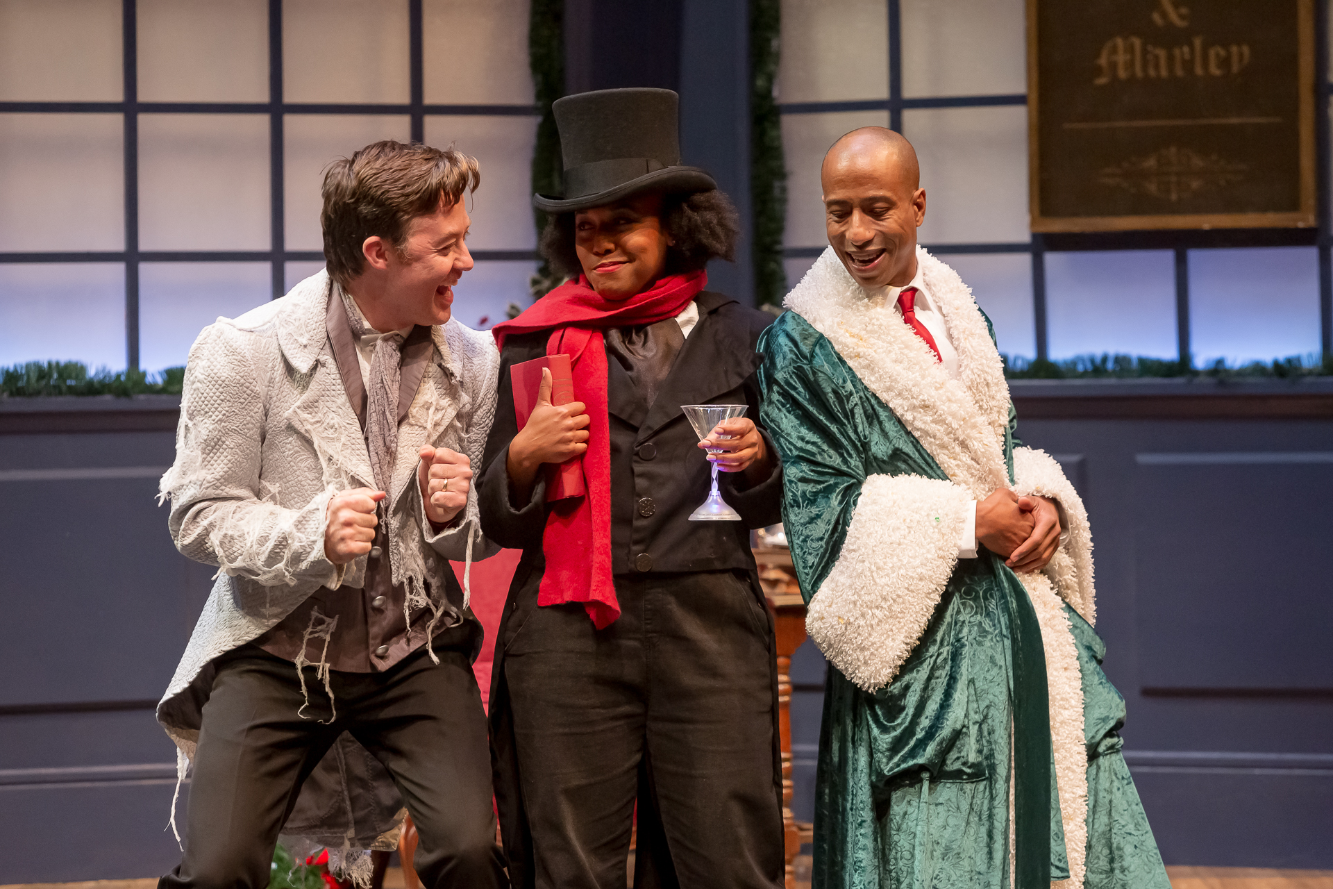 The cast of four has evolved over the years, although one Cincy Shakes veteran, the delightfully rubbery comedian Justin McCombs, has been in every iteration, playing a Christmas- and Santa-loving naïf who no longer wants to be part of annual stagings of A Christmas Carol. Despite the unsuccessful efforts of a true-blue Dickens fan (Candice Handy) to bring Scrooge back to life, she is constantly overruled by McCombs' silly goof and a pseudo-suave, martini-swilling compatriot (Geoffrey Warren Barnes III). The chemistry is a formula for chaotic merriment. The subdued Victorian set, initially backed with video snow falling over a dim Victorian landscape, revolves to reveal over-the-top, floor-to-ceiling holiday decor: twinkling lights, tinsel, a fireplace (with clap-on/clap-off flames), and enough excess to evoke a round of applause from the decked-out audience. In fact, after 16 iterations, many audience members come back every year in Christmas finery, well versed in the jokes, and ready to play right along. When a beleaguered actor says, "I need a hand," everyone is cued to applaud loudly. Cincy Shakes has added a fourth player to the mix, one not envisioned in the original script. For many years it was a raucous and witty Australian member of the company, Miranda McGee, who sat on a sleigh at stage left drinking Foster's and offering wry comments as "Drunk Santa." A new performer, Colleen Dougherty, has taken over that role: More saucy than drunk, she is the first Gen-Z actor to perform in the production and her largely ad-libbed observations and commentary reflect a different generation of humor, including a series of takes on Taylor Swift and a wish for a "Merry Swift-mas." This show is tomfoolery from start to finish. McCombs buzzes around the set with a Norelco electric razor, recalling the TV ads for a sponsor of many early holiday specials. He's also a coy Mary Bailey and Clarence Odbody, George Bailey's guardian angel, and Mr. Gower, the drunk, grieving pharmacist. Handy gets pressed into an array of characters from the Grinch to George Bailey, despite her frustrated efforts to turn the show's attention back to Ebenezer Scrooge. Barnes, whose rapid-fire delivery of lyrics and lines is breathtaking, renders a Kanye West moment (dressed in a black ninja outfit) and is a clumsy Ghost of Christmas Future. All the characters take turns reporting on bizarre Christmas traditions from around the world. Every year director Jeremy Dubin and his crew refresh this funny show with contemporary mentions, updates and characters–a process anticipated and encouraged by the playwrights. That keeps returning audiences on their toes and guffawing. I heard a fellow in the men's room during intermission say, "I just could not stop laughing." That's what Every Christmas Story Ever Told (And Then Some!) is all about. Despite the nonstop hilarity, there are genuine moments. In a re-creation of A Charlie Brown Christmas, after Charlie (Barnes) is berated by Lucy (Handy) for his selection of a bedraggled tree, he wonders if anyone can tell him the true meaning of Christmas. Linus (McCombs, with a blue security blanket) steps into a pool of light and delivers the New Testament verses from Luke 2: "I bring you good tidings of great joy ..." Surrounded by silliness, this is a startling intrusion of stillness and beauty that always resonates with warmth, especially with the wish of "peace on earth and goodwill to men." The show wraps up with a musical number, "Every Christmas Song Ever Sung," a mind-blowing compilation of lyrics performed at high speed, ending with a joyous "We Wish You a Merry Christmas." As intentionally ridiculous as the whole 90-minute production is, it's a joyful reminder of the fun and memories the holidays offer, year after year. It's what the show calls "BHCs," "Beloved Holiday Classics." It has become one itself. Every Christmas Story Ever Told (And Then Some!) runs through December 31, 2022, at Cincinnati Shakespeare Company, Otto M. Budig Theatre, 1195 Elm Street in Over-the-Rhine, Cincinnati OH. For tickets and information, please visit cincyshakes.com or call 513-381-2273. |
