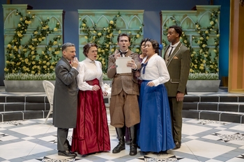 The marriages of Cecily Cardew (Tora Nogami Alexander) and Gwendolyn Fairfax (Kelly Mengelkoch) to, respectively, Algernon Moncrieff (James Evans) and Ernest Moncrieff (Jeremy Dubin), the latter originally known as Jack Worthing, have generated offspring. Their lives remain in thrall to Gwendolyn's domineering mother, arrogant and opinionated Lady Bracknell (Christine Pedi). Cecily and Gwendolyn have decided that their young sons' educations need to be handed over to a serious professional, and he has arrived for an interview in the person of Frank Teacher (Moboluwaji Ademide Akintilo). As his given name implies, Frank is, indeed, a teacher who prizes forthright honesty above all else. Or so it seems. While his actions do differ from the past and present dissembling of the feckless husbands, Frank proves able to weaponize his direct nature to manipulate decisions in his favor. He directly flirts with romantic Cecily and more mild-mannered Gwendolyn, who worries that Ernest's adoration has diminished. When Frank's methods are revealed, he turns his attention to Lady Bracknell, both charming her and appealing to her attraction to wealth. Had Wilde actually written a sequel to his comedy, it seems doubtful that he would have introduced these more modern notions regarding relationships and social mores. Of course, had Wilde had lived into the 21st century, he might very well have evolved to the point of aiming his satirical barbs at more modern attitudes. Nevertheless, the overt manipulations Scovell has given several characters feel a bit disconcerting. That does not diminish the humor the playwright has crafted in the style of Wilde. As Algernon, the antic Evans continues to be self-absorbed, frivolous and irreverent, focused on stylish attire and avoidance of employment. Dubin's portrait of Ernest has taken on more qualities of dithering and uncertainty than in the past. He continues to wear a long-tailed mourning coat, the garb he donned seven years earlier when he announced the death of his nonexistent younger brother. As Cecily, Alexander heightens the young woman's silly, romantic nature. She has also adopted Algy's fondness for cucumber sandwiches, a running gag from start to finish in this production. Mengelkoch's Gwendolyn is full of nervous anxiety–quite natural in the shadow of her judgmental parent–but she shows an increasingly rebellious streak in dealing with her mother and her husband. As in Earnest, the women are the stronger characters and get their own way and the last laugh. As does Lady Bracknell. Christine Pedi (known for hosting on SiriusXM's "On Broadway" channel, as well as a veteran of the long-running "Forbidden Broadway" series of satirical take-offs) delivers a note-perfect performance as the imperious Bracknell. Forced to sample a bread-and-butter sandwich rather than one of her beloved (but already consumed) cucumber sandwiches, she does a long take as if she's eating something close to poison. Scovell has written nearly as many laugh-inducing quips for the snobbish Bracknell as Wilde stuffed into his original play. What's more, she hasn't hesitated to resurrect Bracknell's distaste for Ernest's origins, lost as an infant in a handbag in a remote train station. She grimaces every time it's mentioned. Bracknell is conservative and overbearingly proper, but Wilde also hinted that she had been a ruthless social climber, bent on marrying into the aristocracy. Scovell has picked up on that thread and used it for her sequel. As the new character of Frank Teacher, Akintilo brings a stern demeanor to his supposed honesty, but it's colored with occasional touches of awareness that he's using it toward his desired ends. Akintilo is very tall and extremely starchy, qualities used repeatedly for comic effect. The production has been staged by Stephen Burdman, the founding artistic director of New York Classical Theatre, an enterprising company that presents free productions of classic and forgotten masterpieces in public spaces across Manhattan and Brooklyn. Once this world premiere production concludes in Cincinnati, it will move to New York City for an Off-Broadway for a New York Classical Theatre run in March. The partnership between Burdman's company and Cincinnati Shakespeare has made it possible to bring the play to life on Cincinnati Shakespeare's attractive stage and then take the set and costumes created locally to New York City. The same casti–featuring Cincy Shakes veterans Dubin and Mengelkoch, with New York professionals Alexander, Akintilo, Evans, and Pedi–as well as backstage crew will be working together for the restaging. Of particular note is Samantha Reno's Victorian set, a prim and proper London sitting room ready for tea, replete with Persian rugs, bookcases, and gas lamps (plus cucumber sandwiches) that converts during intermission to a sedate garden in the English countryside with wicker furniture and walls with climbing white roses. Rainy Edwards' period costumes, especially several jaunty outfits for the stylish Algernon, also put the tale in its proper context. Wilde titled his 1895 play The Importance of Being Earnest, A Trivial Comedy for Serious People. He said its theme was "that we should treat all trivial things in life very seriously, and all serious things of life with a sincere and studied triviality." Alice Scovell's sequel, full of high farce and witty dialogue, lives up to that theme. The Rewards of Being Frank runs through February 18, 2023, at Cincinnati Shakespeare Company, 1195 Elm Street, Cincinnati OH. For tickets and information, please visit cincyshakes.com or call 513-381-2773. From March 3-26 it will be presented at New York Classical Theatre at A.R.T. New York Mezzanine Theatre, 502 W. 53rd Street, New York City NY. |
