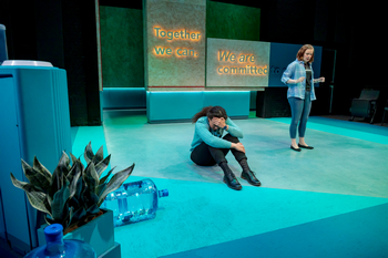 From their droll exchange we learn they have worked at the Services Corporation for several years but barely know one another. Deadpan Margaret is perturbed that a grocery store clerk asked her "What are you?," an indeterminate question possibly about her ethnicity but also indicative of the uncertainty that challenges each of Davis's seven characters. Punctuated with awkward pauses and increasingly bizarre personal revelations by Val, accented by random gurgles from the water cooler, their conversation goes nowhere. A third employee, Anita (Shonita Joshi), stops by on her first day in the human resources department and provides startling suggestions about how they should conduct themselves. In the second scene, we find Margaret at her second job as a shift manager at The Burg, taking overnight orders at the fast-food drive-up window, which materializes with a flip of a wall block to reveal a service counter. Her fellow worker, Bobby (Michael Lepore), whose task is sandwich prep, has a laughably hesitant conversation with her, nervous about crossing lines of propriety with a fellow worker. He expresses a desire to have more responsibility, and when a difficult customer shows up–on a scooter with headlights, a comic incarnation of a car–Margaret hands over her headset. Of course, he's not quite prepared for the task. The 90-minute production has a series of scenes that add more characters. Roxanne (Dwandra Nickole Lampkin) is the difficult customer, fully of nosy suggestions. Dex (Josh Odor) is Val's unlikely Monday night sex partner, full of mansplaining philosophy. Their bed folds down from another wall section. Later we meet Gary (Bill Timoney), who services malfunctioning copy machines that Margaret struggles to maintain. He's near retirement and wonders what will become of him. Over the course of the play's storytelling, Margaret learns more about her "origin," information she doesn't expect or fully welcome, but comes to embrace. The production has been adroitly staged by Joanie Schultz, the Playhouse's associate artistic director. She's had her eye on playwright Davis (who premiered two other scripts this season in Washington, D.C., and Philadelphia) and on this script even before she joined the Playhouse's artistic team a year ago. Schultz has worked as a freelance director based in Chicago with a national reputation for shepherding new works. Origin Story is a fine example of the kind of full-spectrum productions that Cincinnati theatergoers can surely expect from her. The cast are flawless as the seven quirky characters. While Danan's portrait of Margaret borders on sullen, we see moments when yearning breaks through. As Val, Hogg is quirky in the extreme, serving as a catalyst who drives change in others while pushing her own boundaries. Joshi makes Anita the most common-sense character, but she has her quirks, too, and her interactions with Val and Margaret open her up to some different perspectives of her own. Lepore's twitchy rendition of Bobby with lots of wild arm gestures is just right for this nervous character who's seeking to be his best self. Odor's verbose relationship with Val is beyond strange, and when he makes a weird connection with Bobby, it's both humorous and oddly insightful. Lampkin and Timoney, as pushy Roxanne and chatty Gary, are slightly more caricatured, but they each have a touching moments in the play's final moments as they delve with more insight into personal relationships. In a program profile of the playwright, Davis says his intention was to write "a play in which every scene was delightful." He did so by crafting exchanges that explore with wry humor various themes including race, identity, work, debt, family, and so on. Scenic designer Chelsea M. Warren's flexible set makes for quick transitions from scene to scene, complemented by Heather Gilbert's lighting design. There's a surprising quick change of locale for the final scene, which underscores the fact that the characters are on the brink of new decisions and directions. This play is a comedy with intentions. It has a heartwarming ending with characters who discover new paths of personal and familial connections leading them to quite literally taking leaps into something new and affirming. It's a very skillful piece of writing, brought to life by rich portrayals of a collection of memorable characters. Origin Story runs through June 25, 2023, at Cincinnati Playhouse in the Park, 962 Mt. Adams Circle, Eden Park, adjacent to Mt. Adams, Cincinnati OH. For tickets and information, please visit cincyplay.com or call 513-421-3888. |