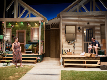 We learn that the previous owner of Jack's house died, likely of a broken heart. And we discover that Lizzy's husband died quite recently in a construction accident. As their acquaintance deepens, Jack shares that his wife died of cancer several years earlier. His move to Lenoraville is an effort at a new start. They're both haunted by their losses and their pasts. As Lizzy observes, "We're the leftovers." But in fits and starts, insulated by a lot of comic banter, they gradually open up to one another. Their baggage does not make that an easy path, and there's no guarantee that they'll be anything but cordial neighbors–she bakes pies for him, he helps with occasional handyman chores. Despite their differing philosophies about washing and drying, they each air their personal laundry and discover that they each have secrets and buried pain. Lizzy jestingly tells Jack she has secrets, and he asks what they might be. "Do you know what a secret is?" she shoots back skeptically. "Oh, I bet you do. I bet you know your way around a secret. In fact, I bet you know the secret of all secrets." She rambles on, having discovered that he teaches physics. "The inner workings of a secret. There must be some law, some axiom of secrets in the scientific community–some algorithm ..." she rambles on, until he cuts her off. Playwright Cefaly has employed several devices to allow us to look more deeply into how Lizzy and Jack's circumstances overlap. She was close with the couple whose home he now owns. He found an old rucksack in a crawl space over the back porch, filled with letters the couple exchanged, revelations of profound love but a not-always-happy marriage. As they compare notes about teaching, Jack asks Lizzy to describe a student who disappointed her, and she describes a sensitive teen whose family life was depressing his expressiveness. Cefaly's pleasantly conversational script enables these revelations to happen quite naturally. Rader, a veteran of shows at Cincinnati Shakespeare and Know Theatre, makes her Ensemble Theatre debut with this production. She's a perfect fit for the quirky, endearing role of Lizzy, full of opinions and creativity, who more than once dances right up close to a relationship with Jack, then veers away. He assures her, "There are worse things that being odd, girl. I like oddness, I like it a lot. You need to loosen up." As they grow closer, Rader does an excellent job of playing a nervous woman who's very guarded about happiness and closeness, things she's never been able to sustain. Gilreath, familiar to ETC audiences from an array of productions there (he also has played Bob Cratchit in A Christmas Carol at the Cincinnati Playhouse in the Park for several years), inhabits the role of Jack, an unflappable, self-contained man with an inner core of grief that he's struggling to move beyond. He's initially put off by women who talk too much, saying he prefers to listen. He tells Lizzy about a one-time date with an eager woman with whom he feels no chemistry. She might have been even chattier than Lizzy, but there's something in his new neighbor that makes him keep chipping away at her defensive veneer. Director Bridget Leak ably steers these two fine actors toward an inevitable connection, one that might not be perfect but that will be what they both desperately need to move on with their lives. She keeps them circling one another warily until a drunken evening splits them wide open with confessions to one another. Scenic designer Brian c. Mehring's side-by-side backyards and porches, each tailored to its owner's personality, are picture perfect, right down to Lizzy's patchy lawn, yard ornaments, and wind chimes and Jack's manicured grass and a statue of the Virgin Mary that Lizzy thinks is weirdly out of character. As always, Shannon Rae Lutz's props give detailed texture to these very human people. The first act ends with onstage nighttime rainfall after a booming thunderstorm, a moment of release and profound insight as Lizzy is drenched and Jack snoozes on his porch. It's a perfect match of tech and storytelling. Maytag Virgin is a fine closing piece for Ensemble's 2022-2023 season, very much the kind of show that Producing Artistic Director Lynn Meyers likes to offer to her discriminating audiences. The dramedy has moments of high humor, but the momentum of Cefaly's script is toward something very meaningful about the restorative power of love and happiness. Maytag Virgin runs through June 18, 2023, at Ensemble Theatre Cincinnati, 1127 Vine Street, Over-the-Rhine, Cincinnati OH. For tickets and information, please visit ensemblecincinnati.org or call 513-421-3555. |