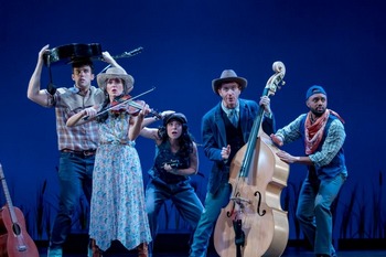 Ring of Fire was created by Richard Maltby, Jr., based on a concept by William Meade. The show premiered on Broadway in 2006, but was revamped and scaled down into a new version by Maltby and Jason Edwards in 2013. It's part concert, part docudrama. Spoken narration to provide a general outline of Johnny Cash's life is delivered in between or interspersed during songs written or made famous by the singer and his wife June Carter. The framework provides enough context to convey Cash's beginnings as the child of poor cotton farmers, how he got his start with Sun Records, how he met his wife at the Grand Ole Opry, his addiction to alcohol and pills, and other life events. Without a traditional book, there isnt much depth, but that's probably because the songs provide that, and the emphasis of the show is on the music. Cash was a storyteller through his songwriting, with many pieces being autobiographical to some extent, so they reflect much about the creator and performer. The songs - whether the country tunes he's most known for, spirituals, rockabilly, or blues flavored numbers - convey the melancholy and complex demeanor of a man that experienced a lot during his life. Musical highlights include "I Walk The Line", "I've Been Everywhere", "Folsom Prison Blues", "Man in Black", and the title number. The five singer/actors also supply all of the instrumental accompaniment for the show, and it's a true delight witnessing their versatility and skill at work. Everyone plays more than one instrument, and some as many as five. Alex Canty is an exuberant young Johnny, and shows off fine dancing as well. David Rowen is a jack-of-all-trades on stage, and impresses throughout. Leenya Rideout is a mean fiddle player, portrays older June with tenderheartedness, and also serves as the show's music director (special kudos for that role). Allison Ann Kelly, who graduated not far away at Wright State University, really sparkles as young June and other characters, and seems to switch instruments for every song. Matt Cusack embodies the personality and deep baritone voice of Cash in his later years with amazing accuracy, and delivers the show's most well-known numbers superbly. The cast sounds exquisite singing harmonies and in playing the unique orchestrations, both of which bring added dimensions and vibrancy to Cash's iconic songbook. Director /Choreographer Marcia Milgrom Dodge has deservedly become a regular at Cincy Playhouse in recent years, and provides apt blocking, character interactions, and tone to this piece. With the lack of depth in the book and the actors all tied to instruments, this show could easily be a stagnant one, but Dodge infuses energy in the staging and transitions to avoid such pitfalls. The set design by Chen-Wei Liao includes a clever reveal and well-suited touches to provide nods to the various settings of the story. Lauren T. Roark's costumes are attractive and varied, and of course feature some of Cash's all-black outfits for which he was known. The lighting by Matthew Richards includes several pleasant effects and many warm hues on the back scrim. Cincinnati Playhouse in the Park's production of Ring of Fire showcases five extremely talented and versatile performers, and worthwhile direction and design. The only complaint one might have is in the choice of the show itself. Playhouse doesn't mount as many musicals as it used it, and with only one scheduled this season, choosing a small-scale, semi-concert title is a disappointment in comparison to past choices. Still, this is a crowd-pleasing production, and one where Johnny Cash's musical library truly comes alive. Ring of Fire: The Music of Johnny Cash runs through October 1, 2023, at Cincinnati Playhouse in the Park, 962 Mt Adams Cir, Cincinnati OH. For tickets and information, please visit www.cincyplay.com. |