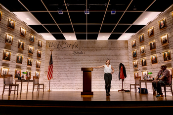 In 2019, after a series of tryouts elsewhere, Schreck performed her show on Broadway, playing her younger self and offering a good-natured dissertation on our nation's history and themes including women's and minority rights, immigration, and domestic violence. Despite a pandemic interruption, What the Constitution Means to Me was nominated for a Best Play Tony Award and was a finalist for the Pulitzer Prize for Drama. Now it's a script available for theatrical production, and D. Lynn Meyers, Ensemble Theatre Cincinnati's artistic director, has been itching to stage it for several years. It's the opener for ETC's 2023-2024, staged by veteran local director Brian Robertson. The show initially seems simple and straightforward: An actor, in this case local professional Connan Morrissey, portrays Schreck as an adult and as a 15-year-old debater. But it's a demanding role, as she's onstage for 100 minutes without an intermission in a performance that slips back and forth in time, while occasionally stepping forward to speak directly to the audience. She portrays the Constitution in plain-spoken, sometimes adolescent terms, making it relatively easy for audiences to understand. She invites them to imagine themselves as American Legion members–in other words, white guys smoking cigars. Two other actors allow Morrissey to occassionally catch her breath. Phil Fiorini is a legionnaire who introduces the debate with awkward humor and tries to manage Heidi's timing, without much success, since she has a hard time containing her enthusiasm for what the Constitution is capable of, describing it as a "witch's cauldron," full of "magical and mysterious" elements, especially the amendments making up the Bill of Rights. Fiorini's role evolves into a character who is distinctly not a legionnaire and who becomes considerably more engrossed in Heidi's message. The third character, simply called "Debater," is played by Sydni Charity Solomon, a senior acting major at the University of Cincinnati's College-Conservatory of Music. She comes on during the latter third of the show, a feisty and articulate representative of another demographic–she's a young Black woman who presents some strong, cogent counters to the issues that Heidi has raised. The show's final segment is a pro-and-con exchange between the two on the topic, "The U.S. Constitution should be abolished." Thirty-five-page booklets containing the text of the Constitution are distributed to everyone in the theater, and the debate concludes the show with a decision about the winner. Schreck's script is full of concepts and theories, profoundly humanized by her opinions and anecdotes. Morrissey's portrait is witty and sure-footed. Portraying young Heidi, she captures some of the nervousness and energy of adolescence, especially when talking about some delicate and personal experiences. But she also steps outside the set's proscenium frame to comment on more adult matters to the audience. Designer Brian c. Mehring's set features high walls emblazoned with the handwritten text of the initial section of the Constitution and festooned with portraits of the signers–all white men, many of them landowners, and some slaveholders. It's a none-too-subtle reminder of how, two centuries ago, a narrow slice of men created a document that could not possibly have anticipated many of the issues shaping today's nation and the world beyond. In many cases, the founders went in directions that seem simply wrong today. Several audio clips from Supreme Court considerations of cases that deal with the central issues the show discusses demonstrate the garbled language and logic of contemporary justices who continue to demonstrate that there's plenty of room for more progress. Schreck's Broadway production was filmed and shared as a video on Amazon Prime beginning in 2020, so some people have probably seen it, and the chance to witness Schreck delivering these stories inspired by her life is definitely worthwhile. Nevertheless, it's all the more immediate and valuable to attend and participate in a live performance such as this one at Ensemble Theatre. Morrissey, Fiorini and Solomon deliver Schreck's messages in powerful, meaningful form, and their delivery, at high verbal speed in Robertson's staging, is viscerally exciting. By the end of the opening night performance, the audience was vociferously participating in and reacting to the issues being raised. What the Constitution Means to Me is a timely piece of theater, perhaps even more in 2023 than it was five years ago. It's a call to action to all American citizens to be informed and engaged, and one that parents would do well to bring teenagers to see, young people who will inherit a nation shaped by this important document. What the Constitution Means to Me runs through October 1, 2023, at Ensemble Theatre Cincinnati, 1127 Vine Street, in Cincinnati OH. For tickets and information, please visit www.ensemblecincinnati.com or call 513-421-3555. |