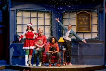 As the show's title suggests and its creators envisioned, it's a mashup of stories, legends, pop characters, and more things that are familiar to audiences, but generously and manically salted with in-the-moment references and local jokes. It's presented with the classic theatre company's tongue firmly in the cheeks of the four spirited and comic performers who spend the better part of two hours poking fun at Scrooge, Dr. Seuss's Grinch, Charlie Brown, Rudolf, Dylan Thomas, The Nutcracker, It's a Wonderful Life, and others. In fact, Cincy Shakes has been presenting editions of this show for 17 years. It never grows old, thanks to the inventive mind of veteran performer Jeremy Dubin, who has directed annually almost since its very first iteration. He has excelled at refreshing it every year with timely humor and antic action tailored to the specific talents of the actors in his cast. This time around, his merry band of mischief makers features Geoffrey Warren Barnes II, Cary Davenport, Candice Handy, and Colleen Dougherty. The performance begins with Dougherty as "Drunk Santa," coquettishly addressing the audience in a sexy get-up that would surely not meet the North Pole's dress code. (Rainy Edwards has designed zany attire for each actor.) Dougherty settles into a sleigh at stage left with an ample supply of White Claw hard seltzer, occasionally pitching empty cans to the stage floor. From there she provides a steady stream of wry observations and sarcastic remarks about the action. She returns after the 20-minute intermission to provide sassy answers to questions submitted by audience members before Scrooge's nightmares and George Bailey's wonderful life are spun into a madcap finale. Handy serves as the steadfast, traditional Dickens promoter: From start to almost finish, she tries to bring the direction of the show back to Dickens' classic, helplessly repeating, "Marley was dead ..." before being pulled down yet another comic rabbit hole. Her antagonists are loud Davenport with attention deficit and suave Barnes, who insists he's just had one drink ("A really big one!"). Once these two rowdies highjack the show from Handy's futile effort to get back to Dickens, the entire set flips around to an eye-popping, hyper-decorated, flashing-light environment designed by Justin N. Locke. It includes a fake fireplace, a wreath that falls down repeatedly, and stage illumination that can be activated with "clap-on/clap-off" gestures. The players fling themselves in and out the stage doors as if they were in a French farce, often appearing just seconds later wearing a ridiculous wig or something completely totally silly. If they encounter any difficulties, they ask, "Please give me a hand." The inevitable response, soon picked up by the audience, is to clap. Audience interaction is the show's byword, some planned and some simply ad-libbed in the moment. If you'd prefer to watch rather than be engaged, don't sit in the front row or in an aisle seat. Every Christmas Story Ever Told (and Then Some!) is a raucous, humorous evening for the actors and audience members alike. Even if you've attended this holiday offering in the past, you'll find fresh new bits, jokes, and laugh-out-loud moments. It's great fun to see Cincy Shakes' accomplished actors having so much fun.sha Every Christmas Story Ever Told (and Then Some!) runs through December 30, 2023, at Cincinnati Shakespeare Company, 1195 Elm Street, Cincinnati OH. For tickets and information, please visit cincyshakes.com or call 513-381-2273. |