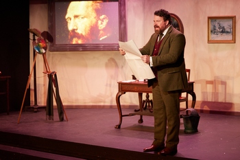 Nimoy (best known for playing the Vulcan Spock throughout the "Star Trek" television series and movies) developed this script from approximately 500 letters exchanged between the brothers. He performed it more than 150 times over a three-year period between 1979 and 1982, when he toured it to 35 American cities. Starting with Theo, speaking a week or so after Vincent's death in 1880, the script is a 75-minute monologue (one intermission) in which the performer moves seamlessly back and forth between the two characters. For Falcon's production, actor Chad Brinkman takes on this demanding performance, directed by David Derringer. It is set on Falcon's small stage with a video screen offering images of numerous artworks by the painter. Otherwise the production is simple–a writing desk with a candle and two side tables, an easel and palette, and a few framed paintings on the wall, perhaps of Theo's gallery. Brinkman's career includes performances in more than one hundred productions in New York and elsewhere. Today he lives in Cincinnati and has directed and designed shows for several local community theaters. His powerful performance in Vincent is memorable. At first he is Theo, the gentle, soft-spoken gallery operator who can barely put words around his grief over his brother's death. Drawing from their extensive correspondence, he recounts several moments in Vincent's erratic life. He worked as an evangelist among impoverished miners and made stern dramatic sermons that surely fell on deaf ears. He tried to woo a cousin who steadfastly avoided his romantic advances, then turned his attention to an uncultured, argumentative pregnant woman of the streets with a child and a mother. Van Gogh's parents disapproved of his irresolute life, but Theo did his best to understand and support him. Brinkman draws clear distinctions between the pair. As Theo, he is refined and well-spoken, often bemused and frustrated by Vincent's antic ways and frequently irrational decisions. Nevertheless, Theo supported Vincent monetarily throughout his life. When Brinkman steps into the role of Vincent, his voice changes to a rapid rasp, and his physical posture is tense and nervous. Occasionally, he puts on a hat or wraps a scarf around his neck, and there are moments when he picks up the palette and mimes painting on the vacant easel. Constantly moving back and forth across the stage and occasionally coming forward to the center aisle that divides the audience, he never allows his performance to become static. Ted Weil's moody lighting design underscores the action and keeps the show mobile and engaging. Theo tells us that Vincent spent his turbulent life pursuing love, while often sabotaging his own efforts. "Life without love," Vincent wrote in a letter, "is a sinful condition." But he struggled to find and practice that emotion, especially when he relocated to the town of Arles, where he shared a cottage with his contemporary artist acquaintance, Paul Gauguin. The two of them spent as much time in fierce arguments as in artistic pursuits; one of those arguments was the cause of Vincent slicing his ear. The citizens of Arles were thoughtless in their interactions with the painter. They mocked his odd behavior, harassed him constantly, and petitioned to place him in a psychiatric hospital. Finally, when he moved to Auvers-sur-Oise in 1888 under the care of a sensitive doctor, Vincent began to paint feverishly, sometimes two canvases a day. Most of his 860 memorable oil paintings were created in the final two years of his life, many focused on bright sunlit subjects, indicating a more stable, happy existence. But he was plagued with depression and epilepsy that brought on hallucinations and seizures, elements also appearing in his art. Theo remorsefully states that in his final weeks, Vincent seemed to be on a path toward a new, more positive beginning just as he ended his life. (It's not mentioned in this play, but it's sad to note that Theo died just six months after his brother. Eventually, their graves were placed side-by-side.) Chad Brinkman delivers an excellent solo performance, convincing and effective as both characters. Theo is overcome by emotion as he seeks to comfort Vincent on his deathbed; Brinkman's depth of feeling is affecting and heartfelt. His performance is one definitely worth seeing. Falcon Theatre has just 75 seats. I urge you to reserve one before this production is over. You won't be disappointed. Vincent runs through February 10, 2024, at Falcon Theatre, 636 Monmouth Street, Newport KY. For tickets and information, visit falcontheater.net or call 513-479-6783. |