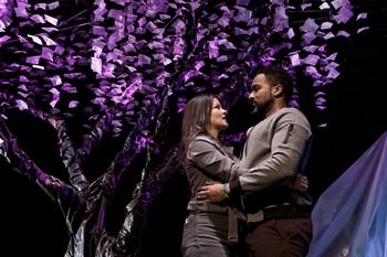 Then it's announced that a miracle drug, Prometheus, is about to come on the market, and that leads to some dramatic changes in their lives and plans for coupledom. The drug essentially stops human cells from aging, so an injection means your current age will be set–forever. There are some limits: No one 35 or older is eligible (in fact, it's fatal for such people), but that's not a problem for Gina and David, both in their early 30s. They decide to apply together for the inoculation, which includes a lot of rules and preparations, so there is plenty of time for more complex considerations and hesitations to creep in. For instance, they have indicated to one another that children are not part of their intentions, but second thoughts creep in. David's rocky relationship with his father, who unexpectedly dies, makes him rethink the implications of living forever. Gina has been close with her only sister, Alex, who is beyond the age of eligibility and has a child. Those factors significantly change the tenor of their sibling relationship when it becomes evident that Alex's family will age while Gina remains unchanged. The couple makes a hurried decision to marry, but they soon realize that they might not be on exactly the same road to the future. They are in love, but the fallout of this decision gives them several reasons to rethink. Playwright Dring is more serious about exploring the push and pull of this wrinkle in time and life than in coming to any clear resolution, be it happy or sad. The drug's name has mythical overtones. Prometheus is the Greek demigod who gives fire to humanity and then is perpetually tortured by the other gods for doing so, chained to a rock and attacked daily by a voracious eagle that tears out his liver. One might think that giving such a name to an experimental drug would be a significant warning flag, but the promise of immortality apparently overwhelms rational consideration. David teaches classics, the study of ancient languages and literature, so mythical references are especially meaningful as the story unfolds–in particular, the play's title. The dictionary definition of "kairos" says it's an ancient Greek word meaning "a propitious moment for decision or action." David has shared one of his textbooks with Gina, and she has learned that Greeks perceived three kinds of time: One, Chronos, is the straight path of time leading toward death. Aion means eternity (what we would call an "eon"). Kairos, she has learned, suggests time as a spiral, as seasons, as rhythm. Put such a title on a play, and it's a sign that life will not move straightforwardly, instead cycling through seasons of existence. Of course, that's not the case for immortal beings. That theme is underscored by Andrew Hungerford's lighting and scenic design in the form of a large tree festooned with leaves made of hundreds of squares of translucent plastic. With colored lighting, the tree passes through seasons, marking the passage of time and paralleling the impact of the decisions Gina and David consider and make. There's not much else in the way of scenery other than a park bench. But the back of the stage is shrouded with plastic draping, also translucent, which changes colors and is occasionally a palette for projected images of the actors during moments when their inner thoughts are shared with the audience by pre-recorded voices over a sound system. It's clear that director Rebecca Wear has worked closely with designer Hungerford to execute these elements–described as various options and choices to be made for specific productions in Dring's script–in ways that enhance and underscore the story and the themes it explores. Wear's actors each convey their characters vividly. Rader, a regular with both Know and Cincinnati Shakespeare Company, brings the feisty and independent Gina to life, guarded at first but not unwilling to explore love. She is a source of energy and strength, but she is equally capable of demonstrating vulnerability. Richmond's David tends to be more soft-spoken. However, he has a complicated past of relationships with his parents and others, and he must swing from eager and compromising to grieving and short-tempered in the face of several unexpected emotional turns of events. He does so convincingly. This production of Kairos is the most satisfying of Know's current season thus far, one that fans of the company's frequently avant garde work should turn out to see. It's left me thinking about what I would do if I had the chance to live forever. I'm too old for Prometheus, but it's an intriguing idea. Kairos runs through March 3, 2024, at Know Theatre of Cincinnati, 1120 Jackson Street, Cincinnati OH. For tickets and information, please visit www.KnowTheatre.com or call 513-300-5669. |