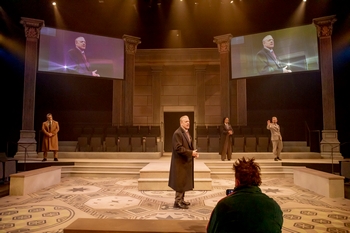 Phillips's production uses the Otto M. Budig's spacious stage to full effect with an immersive in-the-round configuration, with a Stage Gallery, rows of two dozen seats for audience members willing to be extra close to the show's tragic scenes. Designed by Charles Calvert, the set blends classic Corinthian pillars and a stoic grey stone wall with video screens featuring Robert Carlton Stimmel's varied projections that intensify the action. Stimmel doubles as Cinna the Poet, who occasionally employs a handheld video camera to enlarge stage action on the overhead screens. It's a noisy production from the get-go with "DJ Cinna" spinning thumping tunes for a crew of disco dancers who invite audience members to join in before the play's action begins. It flows perfectly into Shakespeare's opening scene of commoners, who are excoriated by a pair of tribunes for being part of such a ruckus. The action moves quickly into an exchange between two Roman senators, Cassius (Candice Handy), jealous of Caesar's popularity and manipulative, and Brutus (Sean Hagerty), wary of the leader's precipitous rise to seemingly unbridled power. Handy carefully but quickly navigates the path to win over Hagerty's earnest and principled Brutus. With their fellow senators–Decius (Geoffrey Warren Barnes II), Cinna (Billy Chace), Murellus (Cary Davenport), Casca (Jeremy Dubin), Trebonius (Justin McCombs)–Caesar's brutal assassination is carried out on the Ides of March. But Brutus refuses Cassius's intention to also execute wily Mark Antony (Warren Jackson), a Caesar devotee. That's the beginning of the conspirators' downfall. Hagerty effectively puts Brutus into momentary favor with the unruly crowd of angry plebians at Caesar's funeral, played by many of the same actors who fill other roles, but clad in blue-collar garb with snap-brim caps. Rainy Edwards's numerous 20th-century Italian costume designs for the company effectively define both the period and the characters. Jackson, who initially represents Mark Antony as a fawning supporter of Caesar, seizes the moment with the famous "Friends, Romans, countrymen..." speech, first praising the assassins for a necessary act, then subtly shifting to sarcastic characterizations, especially of Brutus, "an honorable man." The pliable populace is swayed by his words, despite his pronouncement: "I am no orator, as Brutus is,/ But, as you know me all, a plain blunt man/ That love my friend." Cassius and Brutus feel their moment slipping away and escape. In the play's later scenes, they have landed in Greece and prepare to do battle at Philippi with the forces marshaled by Mark Antony and Octavius, Caesar's nephew–here played by Kelly Mengelkoch as a steely-eyed, fur-clad, cigarette-smoking female don. Handy's bravado as Cassius has been shaken, and Hagerty's honest Brutus is painfully aware that he has made fatefully bad decisions. He realizes that "the tide in the affairs of man" no longer leads to fortune for them but is rather "bound in shallows and in miseries." The two characters argue, reconcile, argue more. Following several scenes of raucous stage combat (Gina Cerimele-Mechley is the fight director), they understand that their fates are sealed. Such scenes are underscored by bombastic sound (designed by Zack Bennett) and flashing video to great, chaotic effect. But the real focus in this production comes from Hagerty and Handy's effective delivery of their often long but meaningful monologues. (Interestingly, while Caesar gets marquee recognition in this play, he is dead by the third act–only to reappear a few times as a morbid ghost. Brutus is truly the protagonist, with Cassius a close second.) Handy gives Cassius the necessary firepower and flash, often as much in furious glances and angry speech; Hagerty's straightforward Brutus is indeed, "the noblest Roman of them all," a man of principle and integrity who strays from his better judgment and too late recognizes the error of his way. In a striking convergence of art and history, Cincy Shakes will present a special event on the fateful Ides of March, foretold in the play as the day of Caesar's demise. To mark the occasion, the company will have a "Togas and Tarot Night," inviting audience members to attend in the spirit of ancient Rome. Guests are encouraged to don togas or Roman attire and, if appropriately attired, to sit in the onstage gallery section. The evening will also feature complimentary tarot card readings in the lobby, inspired by the soothsayer's warning to Caesar. No need to "beware the Ides of March"–this is a chance to celebrate this cleverly conceived production. Julius Caesar runs through March 24, 2024, at Cincinnati Shakespeare Company, Otto M. Budig Theatre, 1195 Elm Street (adjacent to Washington Park in Cincinnati's Over-the-Rhine neighborhood), Cincinnati OH. For tickets and information, please visit CincyShakes.com or call 513-381-2273. |