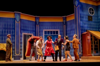 According to the formal dramatis personae provided in the production's program, the melodrama's action "takes place in Charles's private rooms at Haversham Manor on the evening of Charles and Florence's engagement party, Winter 1922." Of course, what we're witnessing is the wholly unfortunate revival of that (fictional) chestnut by the Cornley Drama Society, a community theatre company that selects shows based on having the number of roles that matches their membership. Their track record, described by first-time "director" Chris Bean (Jeremy Dubin), lays a totally shaky foundation for what follows. In fact, even before this show gets started, the Cincy Shakes audience is drawn into assisting the not-very-competent crew readying the stage for the show. A "Crew Dude" (Jared Earland) is searching for something under seats in the auditorium. Stage Manager Trevor (Darnell Pierre Benjamin) is hunting for his boxed set of Duran Duran hits and doing some last minute repairs of the stage floor. Hapless stagehand Annie (Candice Handy) is trying to reattach a cranky falling mantel before the action begins. They recruit innocent audience members to come onstage to lend a hand with repairs or sweeping. It's a prelude to the carefully choreographed chaos to follow as the story gets under way. Charles (Geoffrey Warren Barnes II) is the murder victim laid out on a chaise lounge. The actor playing him is obviously none too dead. He's surrounded by Charles's best friend Thomas (Billy Chace), Florence (Kelly Mengelkoch), John's vampy fiancée and Thomas's sister, and Perkins (Justin McCombs), Haversham's dithering longtime butler. They are mourning the lord of the manor's passing, but it's clear that there are numerous theories about what has happened. Charles's brother Cecil (Matthew Lewis Johnson) enters, and we quickly understand he's having an affair with Florence. A none-too-competent police Inspector Harris (Dubin) shows up to solve the murder, but before long Cecil is also dead, and everyone becomes a suspect. All of this complicated tale is enacted by the hammiest of amateur actors, delightfully portrayed by Cincy Shakes' veteran professionals who are clearly having a grand time overacting. Dubin is a master of exasperation, and Johnson (who is resurrected as the simple-minded gardener) never misses a chance to invent silly gestures and play to the audience–who wholly buy into the tomfoolery onstage. Mengelkoch spends much of her time posing seductively and clinging amorously to Johnson. McCombs, an accomplished physical comedian, brings his comic skills to the put-upon servant. As the set gradually self-destructs, Chace's character's efforts to hold things together and keep things moving are an engine of humor. The enacted stagehands add another dimension. Handy's Annie fights a losing battle with cranky set pieces and missing props, and when Mengelkoch's character is knocked unconscious, Handy's awkward forced performance slowly evolves from fear to zeal. Benjamin's stage manager spends time running to his control board at the rear of the auditorium, where he often forgets to turn off his stage mike, and then hopping backstage or onstage in vain efforts to get things back on course. All these layers of humor have been carefully orchestrated by director Brian Isaac Phillips. Despite the confusion perhaps reflected by my words describing the action, he has smartly assembled the high-speed silliness to keep the story rolling and the outcomes inevitable. In fact, by the middle of the second act, the opening night audience was frequently cheering on the action. Credit also to fight choreographer Gina Ceremele-Mechley who has put together some deliriously silly bits of combat, especially an inept fencing duel that deteriorates into mime as the weapons break down and eventually disappear altogether. Scenic designer Samantha Reno's self-destructing set, given a look that's intentionally amateurish, is as much a character as any of the cast members. By the way, the original London production of this show won a 2015 Olivier Award for the season's best new comedy. You can be assured that if something in The Play That Goes Wrong is intended to misfire, it will do so and with comic assurance. In fact, everything about Cincy Shakes' production goes right–it's an entertaining evening of light summer entertainment. The Play That Goes Wrong runs through June 16, 2024, at Cincinnati Shakespeare Company, Otto M. Budig Theatre, 1195 Elm Street (adjacent to Washington Park in Cincinnati's Over-the-Rhine neighborhood), Cincinnati OH. For tickets and information, please visit www.CincyShakes.com or call 513-381-2273. |