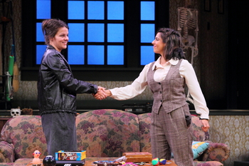 The Human Race Theatre Company in Dayton, Ohio (50 or so miles north of Cincinnati), has championed new works for nearly four decades, and it's giving this post-modern tale of elementary observation and deduction a rollicking production, staged by Heather Wilson-Bowlby. Inspired by Sir Arthur Conan Doyle's iconic sleuth and his physician partner, Ms. Holmes & Ms. Watson - Apt 2B has a heady feminist filter and a bounty of silly situations, characters, funny language, malapropisms and more. Oh, and some spilled (stage) blood. American Joan Holmes (Maggie Lou Rader) arrives in London, running away from a dissolved marriage and a crisis of self-doubt in New York City. Sherlock Holmes (Shonita Joshi)–whom housekeeper Mrs. Hudson (Kelly Mengelkoch) insists on calling "Shirley"–relies on an observed clue of how her new apartment mate holds a clipboard to conclude that Watson must be a doctor. It's not until the show's second act that we learn more of Joan's backstory, a strangely serious interpolation into the middle of a zany farce. But there's plenty to keep audiences occupied until then, since "Sherlock" decides that her next case is discovering why Watson is having panic attacks. Rader does a good job with the somewhat underwritten role of Watson: She's clearly running away from some aspects of her life and would prefer not to be dragged into Holmes's shenanigans. But once things start to heat up, she's all in. Rader, a fine comic actress, makes the most of a role that isn't all that interesting. Conan Doyle's Watson was a drab, rather dull character, and playwright Hamill hasn't given Joan Watson her much more depth. Joshi's Holmes is a manic genius, cavorting nonstop around the cluttered apartment (2B, of course, a lesser version of "221B Baker Street" in the detective's legendary tales) at one point wearing a fencing mask and brandishing an épée, another moment rooting through cabinets for nuns' costumes to hoodwink another character. She has no use for modern tech, preferring her own mental gymnastics to solve cases. Joshi brings a lot of physical energy to her performance, as well as an expressive face and the kind of intonation of classic lines that we know Holmes to utter, exaggerated to a humorous degree. She makes Holmes a whirling dervish. Actor Mengelkoch busily plays an array of roles: Mrs. Hudson, Holmes's fussbudget housekeeper; Mrs. Dresser, the elderly widow of a mysteriously murdered man in a bathtub; and most extravagantly, femme fatale Irene Adler, a onetime actor and opera singer (an actual character from "A Study in Scarlet.") She makes a lot of quick changes of costume, body shape and wigs and keeps them all distinct and quite amusing. The three actresses are regulars on Cincinnati stages who have previously performed for the Dayton theatre company. Mengelkoch and Rader are veterans of many productions at Cincinnati Shakespeare; Joshi has appeared at Ensemble Theatre and the Cincinnati Playhouse. They're an entertaining trio. Matthew Sierra is another entry into the multiple role department. We meet him first as a pompous emcee who mistakenly introduces the show as a serious tribute to Conan Doyle's oeuvre. Then he reappears as Inspector Lestrade, bumbling police officer with a lot of ulterior motives; Elliott Monk (inspired by questionable tech savant Elon Musk), with his eye on elective office in the U.S.; and eventually as Holmes's archenemy, Moriarty. Like Mengelkoch, he gives clear definition to each oddball character. If all this sounds like a lot of comedy thrown on a stage, well, it is–perhaps almost too much. Nevertheless, the cast and director Wilson-Bowlby keep it spinning on scenic designer Jeff Heater's littered apartment (with occasional spotlight accents on familiar games like Clue, a Rubik's cube, a chessboard, and more by lighting designer Diane D. Fairchild). At stage right and left are some useful side platforms representing sleazy London hotels where nefarious things happen–one with a bathtub and one with a bed. The set has two pairs of doors, a predictable scenic element of most any farce, that suggest moving from downstairs to the upstairs apartment with a few quick slams. It's always a welcome surprise when Mengelkoch or Sierra appear at the door in one of their fanciful characters. A bit of online research reveals Hamill's frothy script has had numerous productions over the past two years. It has served as a lightweight summertime comedy for several companies. For Human Race, its proximity to Halloween (there is a skeleton onstage) is likely to be attractive to seasonal celebrants. Ms. Holmes & Ms. Watson - Apt 2B runs through October 20, 2024, at Human Race Theatre Company, 126 N. Main Street, Dayton OH. For tickets and information, please visit humanracetheatre.org or call 937-228-3630. |