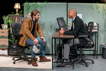 Their exchange seesaws back and forth through a series of scenes. During the 90-minute performance, we learn more about their differences. Ryan is divorced and angry at the world, hoping for shared custody of his daughter, Crystal, but sensing that the system does not work for someone like him. He's a blue-collar guy, working in a yogurt factory. He barely gets by paycheck to paycheck. Keith, on the other hand, is obviously well educated (probably over-educated for his mundane, complex job), meticulous, professional, and financially stable. But he's edgy, and we begin to see he's not quite as composed as he first comes across. Ryan is white and straight; Keith is Black and gay. Early on, Ryan looks at Keith and says with profound honesty, "I think we share a specific kind of sadness." That seems like an odd observation given their differences. But we increasingly learn how much they have in common. Ryan fears losing custody of his 18-month-old daughter in the angry aftermath of his divorce. Keith has been fostering Willa, a little girl of similar age. The girls are at the same daycare center, and that's where the men crossed paths and Ryan learned that Keith worked in the mortgage business. Ryan is a poor candidate for any kind of loan due to his recent divorce and his meager finances. He yearns to purchase land his family once owned to establish a place to raise Crystal, but his chances are slim. Keith offers pragmatic advice regarding the unlikelihood of Ryan qualifying, but as they become more familiar, he relents and tries to help. Keith hopes to adopt Willa, but an aunt, upon learning that Willa is in the care of a gay man, is pursuing her own adoption. His prospects are no better than Ryan's. As time passes, we learn much more about the two men. Despite their different pasts and existences, more and more common ground emerges, rooted in their frustrations and hopes about being good parents. Other than one emotional outburst, there's very little physical action in this production, staged sensitively and thoughtfully by Piper N. Davis. In a short sequence, the men polish off a bottle of whiskey and engage humorously in more and more revelatory conversations. But the actors easily demonstrate they are both headed for the sadness and circumstances that Ryan sensed early on. That said, there's something else, and it speaks to Hunter's unusual title: The exchange between these frustrated men proves to be "a case for the existence of God." Not that they personally achieve what they hoped for, but they come to appreciate the unlikely friendship that takes root between them and the support they are able provide for one another. A final imaginative scene suggests a positive future outcome, although it's not what they thought they were working toward. Nevertheless, it demonstrates how God works in mysterious ways, not always following expected paths but achieving a meaningful outcome. Davis's direction brings out fine performances by both actors. As Ryan, Spraul's rough-edged, angry fear of financial ruin affecting his daughter's life is palpable. And Jenkins's portrait of a tightly wound guy who eventually becomes unraveled is convincing and heartfelt. Neither character is perfect or even very likable, but the sense of sadness they each feel seems to offer the foundation for a path forward. Not an easy one, but one that makes sense. Hunter's script, in the hands of a Davis's steadily paced direction and brought to life by these two fine actors, makes for a powerful, moving story. A Case for the Existence of God runs through February 22, 2025, at Know Theatre of Cincinnati, David C. Herriman Center for the Performing Arts, 1120 Jackson Street, Cincinnati OH. For tickets and information, please visit knowtheatre.com or call 513-300-5669. |