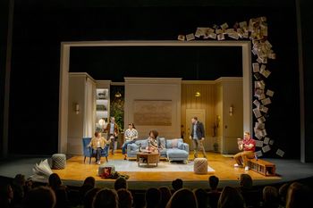 It's probably safe to assume that many theatregoers are also book club members, so there's a fundamentally familiar aspect to the show's set-up: Five people gather regularly at the home of Ana (Marina Shay), a tightly wound journalist who always wants to be in charge, and her husband Rob (Eli Mayer), a likable but seldom serious attendee who avoids reading long books. He's in it for the food. Will (Matthew McGloin) went to college with Ana and Rob and was Ana's boyfriend, despite his none-too-well-hidden sexual orientation. That lasted until athletic Rob, Will's roommate, turned on his manly charms. Will was the best man at the wedding and the co-founder of the book club; Ana is convinced he still carries a torch for her. Two more women, Jen (Kim Wuan) and Lily (Annalisa D'Aguilar), round out the group. Jen is a paralegal devoted to books, but who's made some ill-advised personal decisions that resulted in a notorious scandal. Sassy Lily, another newspaper reporter, proudly announces that she's recently arrived from Akron and become a colleague of Ana. The fact that she's African-American might have been a factor in inviting her to the group. For many book clubs, membership is a tightly held circle, averse to newcomers. Jen noticed Alex (Adam Langdon) in a coffee shop reading "Twilight," Stephenie Meyer's popular vampire tale, and thought he might like to join their upcoming conversation about this book. Ana and Will are immediately shocked and resistant when he turns up uninvited and ready to hold forth. His annoyingly knowledgeable affability adds some sharper spice to the mix. Zacarías's storytelling employs a meta framework, suggested immediately by scenic designer Jo Winiarski's clever book references. A chaotic flume of books tumbles upward on the stage left wall beyond the pronounced proscenium frame. The lower stage right corner floor is curled as if several pages are about to be turned. The show's intermission is cleverly signified by the projection of the double-bar pause icon. Such touches remind us that Ana has agreed to allow avant garde Danish filmmaker Lars Knudsen to place a video camera in her living room to record their bimonthly conversations for a documentary. Naturally, self-consciousness prevails, alternating between dismay at saying revelatory things or naively confessing to feelings or judgments that were not meant be shared more broadly. Further compounding everyone's nervousness about how they are portrayed, we learn in the middle of the second act that Ana has been writing a roman á clef novel about a book club–featuring thinly disguised and comically enlarged characters resembling everyone in her group. Robison's deft direction keeps the show's comedic top spinning, and his cast of able performers are wholly invested in the laugh-out-loud hi-jinks. Shay's Ana slowly comes unwound as her fierce grip on steering the group dwindles. Mayer portrays Rob with a constantly startled then deflated air, when his principal motivation for attending has been the evening's snacks. With piercing snarkiness, Langdon makes Alex the catalyst for arguments with Ana and Will about the distance between "great literature" and pop culture. D'Aguilar and Wuan represent a number of perspectives that might be portrayed as "woke" in today's heated cultural atmosphere. Of course, all of this has been craftily written by Zacarías to touch on more serious themes, but every encounter resolves quickly and humorously Five actors (D'Aguilar, Mayer, Wuan, McGloin and Langdon) have singular "documentary" interviews shown as videos projected on Ana's living room wall (over a bland beige modern painting), momentarily playing a skydiving senior, a Secret Service agent, a prison guard, and so on. They also happen to be book lovers with various motives. These briefly expand on the relevance of books and reading in varied people's lives, and they add some dimension to the show's underlying themes and philosophies. They're amusing caricatures but, while humorous (and demonstrative of the actors' breadth of talent), they nevertheless feel like unnecessary distractions. The opening night audience was fully, vocally engaged in this production–gasping at revelations, laughing at startling situations, and exclaiming at turns of events they didn't see coming. All in all, it makes for a rollicking, enjoyable evening The Book Club Play runs through April 20, 2025, at Cincinnati Playhouse in the Park, Rouse Theatre mainstage, 962 Mt. Adams Circle in Eden Park, adjacent to Mt. Adams, Cincinnati OH. For tickets and information, please visit cincyplay.com or call 513-421-2555. |