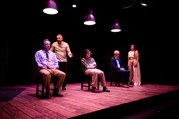 One by one, three more characters enter and take a seat. Aaron (Ryan Bowron) is an addict who recovered to become a drug counselor after a life of difficult dependency. Nate (Tristan Pianovski) is a nervous, withdrawn high school dropout now working as a construction worker. And James (Bill Keeton) is a retired, workaholic emergency room physician, initially very guarded with his answers. Eden and Lucas ask probing, non-judgmental questions of each man to draw out the details of his life. The focus is on choices they've made and their consequences. Without being harsh, the interrogations increasingly reveal interconnections and troublesome details. As the focus shifts from one man to another, Weil and Grant step out of their interviewer roles to briefly inhabit people remembered from each life. There's a bully who mistreated Aaron in a foster home, an abusive father who constantly berated Nate, and James's hardworking wife and their picture-perfect teenaged daughter. Their stories slowly intertwine in Vogel's carefully written script. The play's two acts, each about 45 minutes, have an intermission that bridges the gap between "During" and "After," as Vogel's title terms the course of action. The first act has laid out each man's circumstances and decisions. In the second act, we learn the repercussions and devastating consequences of their actions. Eden and Lucas's questioning continues, and we learn more about why these men have been brought together and come to understand what their interviews will lead them toward. Director Ed Cohen put this production together on relatively short notice. During/After was not initially part of Falcon's 2024-2025 season, so it was sandwiched in between two previously scheduled shows. Cohen, who has often staged shows for Falcon, was recruited for this assignment, allowing just a few weeks of rehearsal. But his cast have responded with strong performances. Weil and Grant are called upon to detail their roles as interrogators, as well as to convincingly play the varied characters from the lives of Aaron, Nate and James. There is never a problem discerning who they are personifying. As Aaron, Bowron paints a picture of a life scarred by trauma, from hostile foster care to prison, in a convincing demonstration of a man struggling to make something of himself but lacking the persistence for ultimate achievement. Pianovski's embodiment of Nate is most affecting, a teen lacking in self-confidence, badgered and bullied by his abusive father and ignored by classmates at school. To demonstrate Nate's desperation, Pianovski is often doubled over on his chair or hugging his knees in an almost fetal position. As James, Keeton comes across as a hard-working, caring man whose sense of duty to medical care keeps him distant from his family. At first he seems aloof and stuffy, but increasingly his tightly held guard is dropped to allow desperate grief to surface. This is not an easy set of tales to watch. Anyone troubled by suicide, violence, and/or abusive behavior should think twice about attending. Nevertheless, it's a fascinatingly told story of the actions people choose and the unwitting outcomes that can result. During/After is very watchable with several unexpected twists and turns. It wraps up with a few whiffs of possibility, but it's been a tough path to get there, and what comes is left is very open ended. Kudos to Falcon for making room in its season for this serious work, as well as to Cohen and his cast for creating compelling performances. Vogel lives in Cincinnati and has written novels, short stories, brief plays, and one other full-length drama. She is a writer to watch. During/After runs through April 12, 2025, at Falcon Theatre, 636 Monmouth St., Newport KY. For tickets and information, please visit falcontheater.net or call 513-479-6783. |
