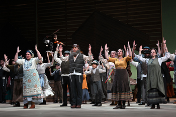 Using an immense cast (20 named roles, an adult chorus of roughly 30, plus nearly 20 children, as well as 11 dancers from Cincinnati Ballet's Second Company), director Crystal Manich has staged the beloved tale of the philosophical milkman Tevye, his fretful but devoted wife Golde, and their five daughters with attention to historic detail and the exploration of faith in an evolving modern world. Drawn from stories by Sholem Aleichem about the joyous lives and imminent suffering of Jews in a small Russian town, the show is receiving a sold-out run at Cincinnati's historic 1878 Music Hall. From the stupendous mass choreography of the entire company for the opening number, "Tradition," to the heartbreaking finale, "Anatevka," as the town's residents solemnly leave their homes behind, the three-hour production lands solidly with powerful, evocative emotions. Iconic actor Zero Mostel put his indelible imprint on the role of Tevye in its original production, and his raffish performance has been the model for numerous subsequent interpreters of the role. Cincinnati Opera has cast German actor Max Hopp: He has played Tevye often in Europe, but this is his first time to perform it in English. His approach to the character is more understated, not missing the humor written into Joseph Stein's script but handling it with wry, humane twists that add an immediacy to the story. Tevye has numerous searching conversations with God, delivered straight out toward the audience. He yearns to do the right thing by his daughters, but it's 1905 and times and mores are changing, abandoning "traditions" that have been Tevye's lifelong touchstones. The arranged marriage of strong-willed Tzeitel (Rachel Kobernick) to the town's butcher, ebullient Lazar Wolf (Phil Fiorini), who's older than Tevye, is not to her liking. She and her childhood friend, modest Motel (Arnold Livingston Geis), an aspiring tailor, have pledged themselves to one another–without Tevye's permission. Their joyous reaction to Tevye's ultimate approval, "Wonder of Wonders," is sung with great energy. Tevye arranges for Perchik (Simon Barrad), an outspoken young intellectual, to educate the girls; Tevye is dismayed when daughter Hodel (Rachel Blaustein) falls for the idealistic revolutionary and chooses to follow him as he seeks to fight against authoritarian rule. Next, perhaps the hardest turn of events, happens when daughter Chava (Jennifer Zetlan) falls in love with a non-Jew, Fyedka (Henry Benson). Hopp's Tevye is remarkable in his see-saw resistance and ultimate acceptance of these situations. Golde (Victoria Livengood), often exasperated with her husband, also depends on him, even if she finds it hard to affirm in the affecting "Do You Love Me?" Fiddler's comic high point is the brilliantly staged "Tevye's Dream." In it, Hopp's manic Tevye amusingly convinces his wife that the ghost of Fruma-Sarah (Sarah Folsom), the butcher's late wife, will wreak havoc if the forced marriage goes forward. The number builds and builds, eventually with Fruma-Sarah with frightening ghostly wings swooping across the Music Hall stage on Tevye and Golde's rolling bed. Since its earliest days, Cincinnati Opera has been accompanied by the renowned Cincinnati Symphony Orchestra. The complement of musicians, conducted here by Levi Hammer, is probably three times the size of orchestras that typically accompany Broadway musicals, and their support is glorious from start to finish. Of particular importance is CSO violinist Charles Morey, who is onstage as the "fiddler," the show's symbol for the crazy imbalance that Tevye portrays. Morey is sometimes highlighted and at other moments blended into the periphery of the action, but he is repeatedly a haunting distillation of the fragility of life in Anatevka. Andrew Boyce's scenic design is minimal but effective. The action is framed with rough-hewn lumber, material that homes were likely built from. Behind the action are two-dimensional silhouettes of the town's humble dwellings and buildings. An array of tables move on and off the stage in various configurations. When the "Sabbath Prayer" is sung by Tevye's family, we see glimmers of other candle-lit Sabbath meals that open up to reveal the devotion of the entire community. Thomas C. Hase's lighting design is essential to the storytelling. When Tevye steps into one of his conversations with God, the action around him freezes and dims, and he steps into a pool of light. At several moments of intense action–the joyous "To Life" and the sad departure of the townfolk as the show's conclusion–the lighting throws large shadows behind the action. It's subtly effective, as is the constantly changing colors projected behind the action. Fiddler on the Roof is about the power of tradition and family, caught up in the gears of time and the need for adjustment and acceptance. It's also a warm-hearted celebration of community, sometimes combative, sometimes supportive. Cincinnati Opera's production is a gift to audiences, one that's likely to be remembered for years to come. Cincinnati Opera's Fiddler on the Roof runs through July 27, 2025, at Cincinnati Music Hall, 1243 Elm Street, in the Over-the-Rhine neighborhood, Cincinnati OH. For tickets and information, please visit www.CincinnatiOpera.org or call 513-241-2742. |