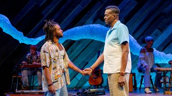 At first glance, Jean and Jonah seem very disparate. The father is romantic, idealistic and poetic; his son is gay, pragmatic and sardonic. Their challenges around connection seem apparent. But as they make their journeys, parallels are revealed, especially through the songs. Director Timothy Douglas told me in a July phone interview, "It's not a play, it's not a musical." He preferred to term it "storytelling" and suggested, "The evening is really a meditation, in no way a traditional play." "Meditation" is indeed a good way to describe this production, which is enhanced by several design elements. Set designer Tony Cisek has created a wall of diagonal, rough-hewn barn siding, with a slash that might be considered a dividing line between the "mountain" and the "sea" of Agustin's title–as well as, perhaps, the circuitous path Jean and Jonah follow in their journeys across the United States. Lighting designer Harold F. Burgess II has illuminated that slash, which actually surrounds all four of the Rosenthal Shelterhouse Theatre's upper walls. Its color changes with the emotions of the moment, from a placid blue at the beginning when Jean sings "Sonjé M (Remember Me)" as he bids farewell to a lover in Haiti, and then to warm orange at other moments, including the heartfelt duet "Oh My Love" that concludes the 80-minute performance. Burgess's lighting also heightens the individual inner thoughts of the characters and sometimes draws attention to the musicians who also provide evocative sound effects. Morrison (also the production's music director) plays guitar, banjo, and a small keyboard; Fobbs uses an array of percussion devices including Caribbean drums, a rain stick, clickers, and a tiny wind chime. They also support the actors' singing of other musical numbers, especially "I Was Too Late." Under Douglas's sensitive, aesthetic direction, Where the Mountain Meets the Sea blends all these elements into a mélange of sounds and images, resulting in a perfect environment for the storytelling of these journeys across America. We learn more from Cornelius's Jean, a onetime teacher in Haiti, reduced to being a luggage handler at the Miami airport. He is a traditional romantic and has loved many women. He has struggled to understand his son, who was born and raised in a very different, more modern world, without the traditional cultural values Jean absorbed in Haiti. Cornelius gives the role warmth and love, framed with a yearning to learn more. Boyd's portrait of Jonah is that of a spikier young man, relocated to Los Angeles for education and gay lifestyle. He portrays his life with humor and desire, especially in a series of romantic encounters that mirror his father's relationships with women. When Jonah learns of Jean's death and that his ashes remain in Miami, he decides to undertake a complex journey to learn more. He doesn't drive, so he must use alternative means–Amtrak, Greyhound, bike, and bummed rides–to claim Jean's remains and deliver them for burial in Port au Prince, Haiti. As Jean and Jonah's singular recollections run parallel, commonalities and similarities emerge. Despite their generational differences, they both desired affection and companionship. At one amusing moment, their differing journeys parallel with visits to Mt. Rushmore, where they are watched over by the stern eyes of past American presidents. Where the Mountain Meets the Sea has had an evolving production history. It began in 2020 as a commission by Actors Theatre of Louisville for its Humana Festival of New American Plays. The pandemic meant it had to become a virtual production that paired Augustin's script with music by the Bengsons, a folk duo who have created, performed and recorded original music for two decades. In 2022, the show had an Off-Broadway staging by the Manhattan Theatre Club, again with the Bengsons involved. Then in 2024 it was presented at Arlington, Virginia's Signature Theatre. Timothy Douglas staged it there. Cornelius played Jean, and Morrison was an actor and musician. For the Cincinnati Playhouse, Douglas newly adapted it with the addition of Boyd and Fobbs, using the Bengsons' songs. Based on reviews of those previous productions, it seems that the essential romance and profound portrait of parent-child understanding have been further distilled. Where the Mountain Meets the Sea is a deeply emotional, well-told tale. Where the Mountain Meets the Sea runs through September 28, 2025, at Cincinnati Playhouse in the Park, Shelterhouse Theatre, 962 Mt. Adams Circle, Cincinnati OH. For tickets and information, please visit www.cincyplay.com. |