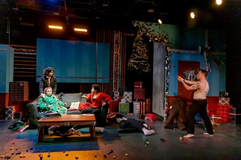 Here's the premise: Christmas Eve, 1988. Mack (Rory Sheridan in the Bruce Willis action hero role) finds his screenwriting star on the rise based on the success of the film. But his marriage is on the rocks. He returns home for the holiday with his wife and kids, who are conspiring to reignite their parents' romance. Rouse and Andrew Ian Adams reprise the rambunctious teenage roles they played in 2024, enacting a harebrained plan to make Dad a hero again, wearing garish green holiday onesie pajamas decorated with Christmas garland and ornaments. Unfortunately, late night intruders led by Hans Gruber (Adams again, comically channeling the menacing role played by late actor Alan Rickman) and a handful of German goons (Rouse wearing a staggering number of comic wigs) are after Mack's advance for another film. They plan to ransom hardworking, frustrated wife Bonnie (Bea Fields, who also plays nice-guy inept cop Al). The raucous tale has Mack and the kids on an adrenaline-fueled misadventure to save their family–or "die hard" trying. In the process, they more or less destroy the three-bedroom family home on Christmas Eve instead of the office tower demolished in the movie. It's a zany production, staged again by Tatiana Godfrey, with a wild plot and a tighter script than a year ago, especially with moments of second-guessing by Mack about setting an example for his kids and questioning whether violence is really the best way to pull his family together. Of course, the parody calls for more-or-less scene-by-scene recreation of some of the movie's memorable lines and special effects in imaginative ways, including a foil-wrapped carton that's used as an air-conditioning duct that Mack has to squirm and scramble through in the course of battling the intruders. The production uses a few video clips from the movie to remind the audience of the cinematic carnage. Know gives this madness a PG-13 rating with the warning "an array of weaponry, snorting pulverized candy, comedic Hollywood violence and language." The set, designed by Sarah Beth Hall, features over-the-top holiday décor–two trees laden with ornaments (including a few surprise items pulled from the branches when needed), large gift wrapped presents and an army of ungainly mannequins portraying Gruber's goons as Mack picks them off. (The comic weapons wielded by the combatants are silly plastic toys.) Audience reactions are directly correlated to how much of the 1988 film they recognize. There's a lot of slapstick humor, but the hilarity feels a little too forced for too long, even with the show's fleet performance time–about 100 minutes including a 20-minute intermission. Nevertheless, Rouse and Baldwin's script requires adept comedic acting that all four performers handle energetically–including some cartoonish fight choreography. Rouse, Adams and Fields must constantly rotate through their various roles with some crazy quick costume changes, as well as amusing accents and physical insinuations. Sheridan ably portrays a character rooted in Bruce Willis's action role but gives him some tongue-in-cheek introspection. Playing the second act in a bloody, sleeveless t-shirt with manic intensity results in some of the show's best moments. Opening night was sold out, and it seems likely that this show will do well again this year. Enjoyment of the production might be enhanced by viewing the 1988 film in advance. It will help to fully appreciate the sharp satire the co-playwrights have woven into their script. Die Hard Is a Christmas Movie runs through December 21, 2025, Know Theatre of Cincinnati, David C. Herriman Center for the Performing Arts, 1120 Jackson Street, Cincinnati OH. For tickets and information, please visit knowtheatre.com or call 513-300-5669. |