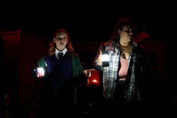Steph (Ella Prather) is the schoolgirl, wearing a dark plaid jumper and skirt, a white shirt and tie, with her curled hair pulled back with barrettes. We learn that she is nearly 16. She's frantic with fear, searching for her missing friend Charlotte. She wanders into a rundown, empty bar where sardonic Bell (Kaitlin McCulloch) oversees a claustrophobic establishment with zero patrons; she spends her time reading and listening to music. Steph presses her for information about Charlotte, convinced that her friend was last seen entering the bar. Bell feigns ignorance, but we have the feeling that she knows more. But what? The 75-minute first act trips through a series of conversations that veer between possible truths, lies, and fantasy punctuated by startling periods of lights-out darkness. High-strung Steph is repeatedly reduced to a gibbering child, crouched under a table, rapidly counting numerically as a device intended to calm her frayed nerves. Much of the act is performed with battery-powered lamps the only illumination as context for Bell's made-up stories–or possibly true tales–about what might have happened to Charlotte, each one more dire than the last and each one twisting Steph's paranoia more tightly. One story describes capturing a man who might have been a perpetrator, imprisoning and torturing him. Another is about two young boys who might or might not have seen something fearsome that attracted their attention. As they explore it, their understanding wanes, and they are reduced to responding with shrugs and nothing more, even as horrific details seem to emerge. Several long monologues by Bell terrorize Steph repeatedly, unsure of whether they are information or invention. Following intermission, a 20-minute second act plunges into a more a definitive account, possibly of something that actually happened–although the foregoing narratives leave the audience wary of drawing conclusions. Steph mentions visiting a police station, and Bell forces the girl into role-playing and reenactment to dig deeper into possible outcomes. During this action, again plunged into darkness, Prather periodically wanders through the audience in Falcon's small theater space seating only 50 or so people. It's a physical representation of the twisted path Steph is trying to make some sense out of. Eventually, a few shreds of reality seem to be revealed, and then the play ends–leaving it up to the audience to decide the meaning to be drawn from two hours of contorted stories and angst. The fragmented, non-linear narrative is as disorienting as the random stretches of darkness. It's not an easy show to watch, but certain sad topics are clearly part of playwright Raczka's intention in her script: male violence against vulnerable women, responses to trauma, and how telling stories can lead to both doubt and understanding. This is a tough, teasing piece of theatre to watch. Director Samantha Joy Weil has found a pair of fine actors to play Steph and Bell. Both are theatre grads from Northern Kentucky University and well suited to their roles. Petite, prim Prather is convincing as a nervous, naïve teenager zealously trying to get answers. McCulloh, a more physically dominant performer, has the more complex role, vacillating from a don't-bother-me adult to someone who seems intent on helping this struggling youngster get through a traumatic experience. Weil ably steers the pair through this wordy, circuitous tale right up to the final revelation of several shocking truths–or should I say seeming truths? It's definitely a provocative piece of theatre. A Girl in a School Uniform (Walks Into a Bar) runs through February 7, 2026, at Falcon Theatre, 636 Monmouth Street, Newport KY. For tickets and information, please visit falcontheater.net or call 513-479-6783. |